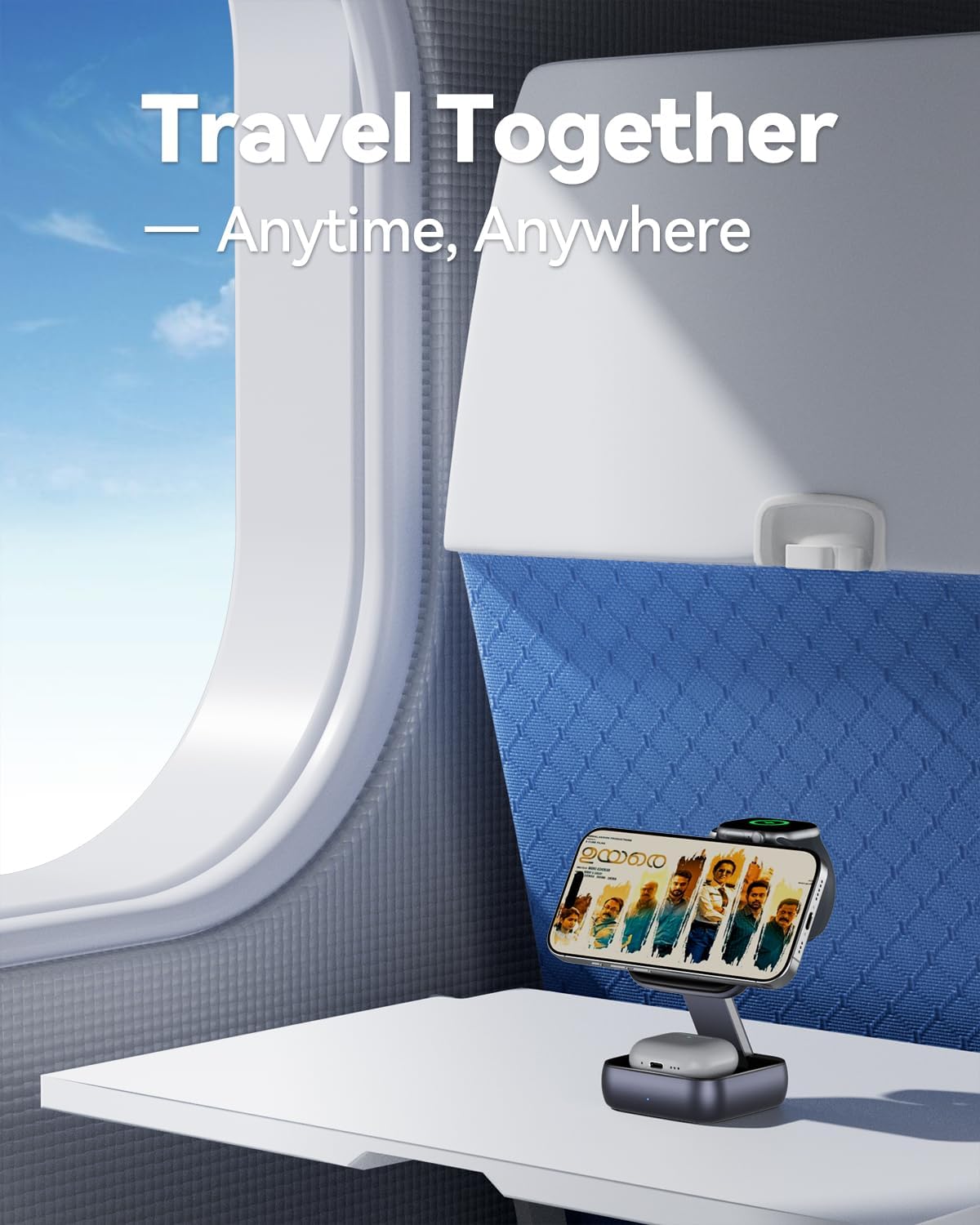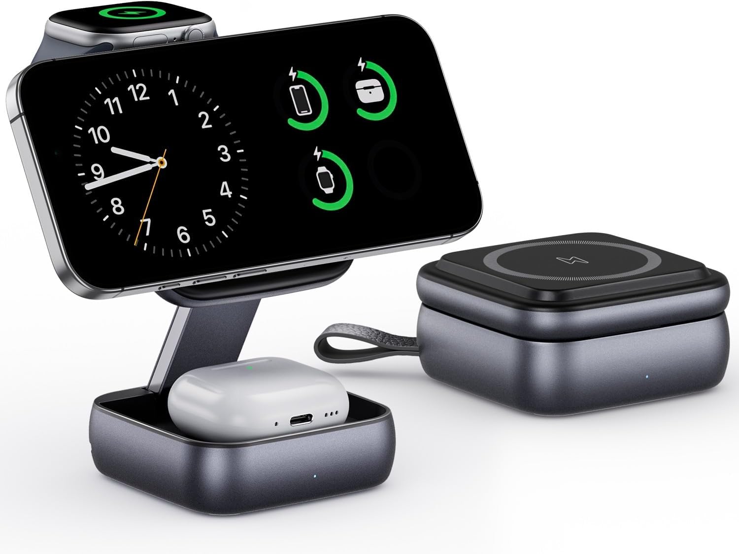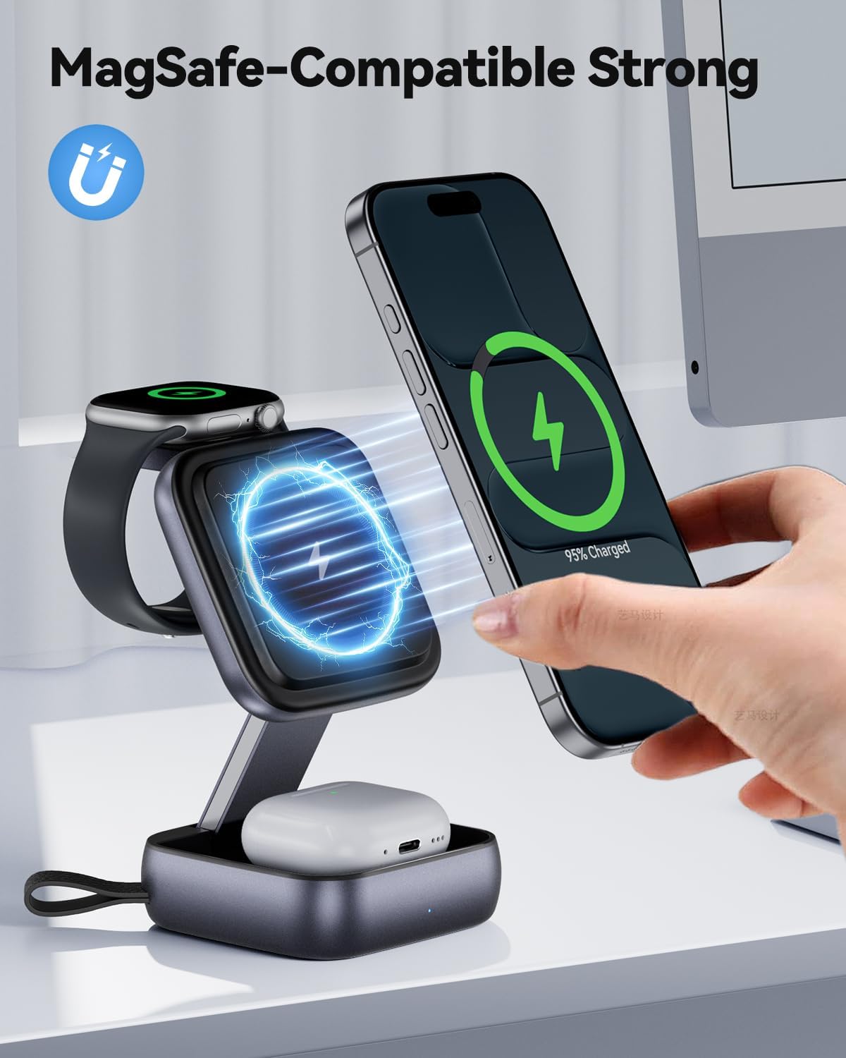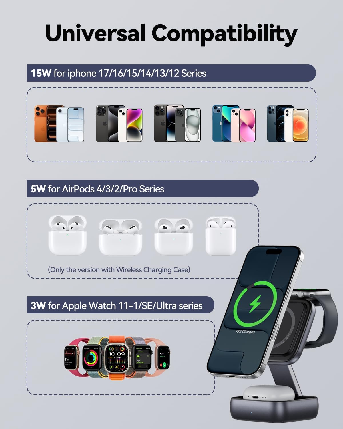 2026 Upgrade 3 1 Charging Station – Wireless Charger 3 in 1 for iPhone 12–17, AirPods 2–4/Pro and Watch Series 2–11/SE/Ultra; Travel-Ready 3 in 1 Magsafe Charger with Stable Triple-Device Power
