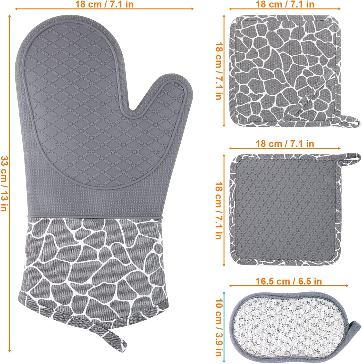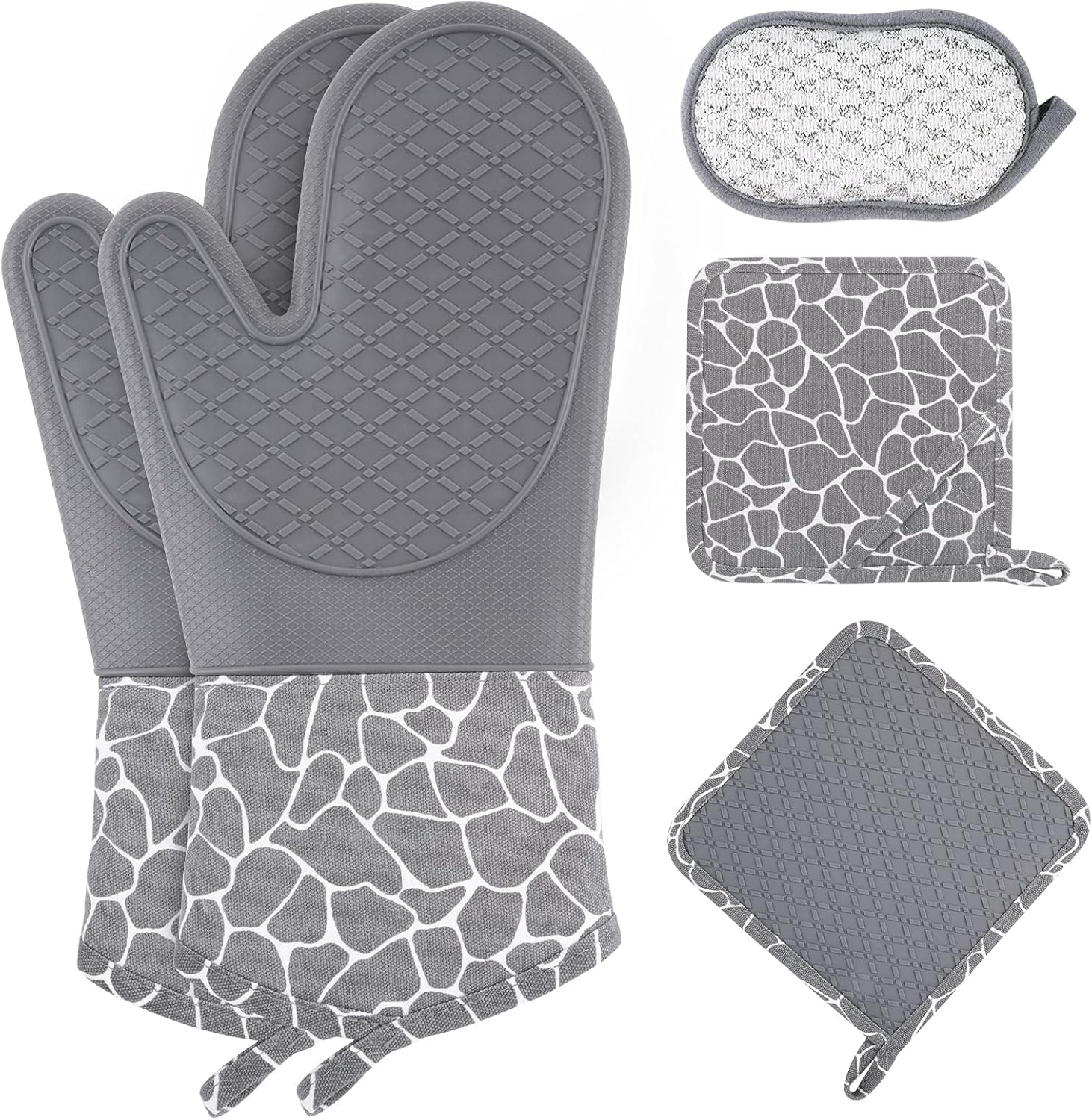 5-Piece Oven Mitts and Pot Holder Sets, Anti Slip Silicone Oven Gloves, Kitchen Gloves, Oven Mitts with Quilted Lining, Hot Pads for Kitchen Baking Cooking, Cleaning Cloth, Gray