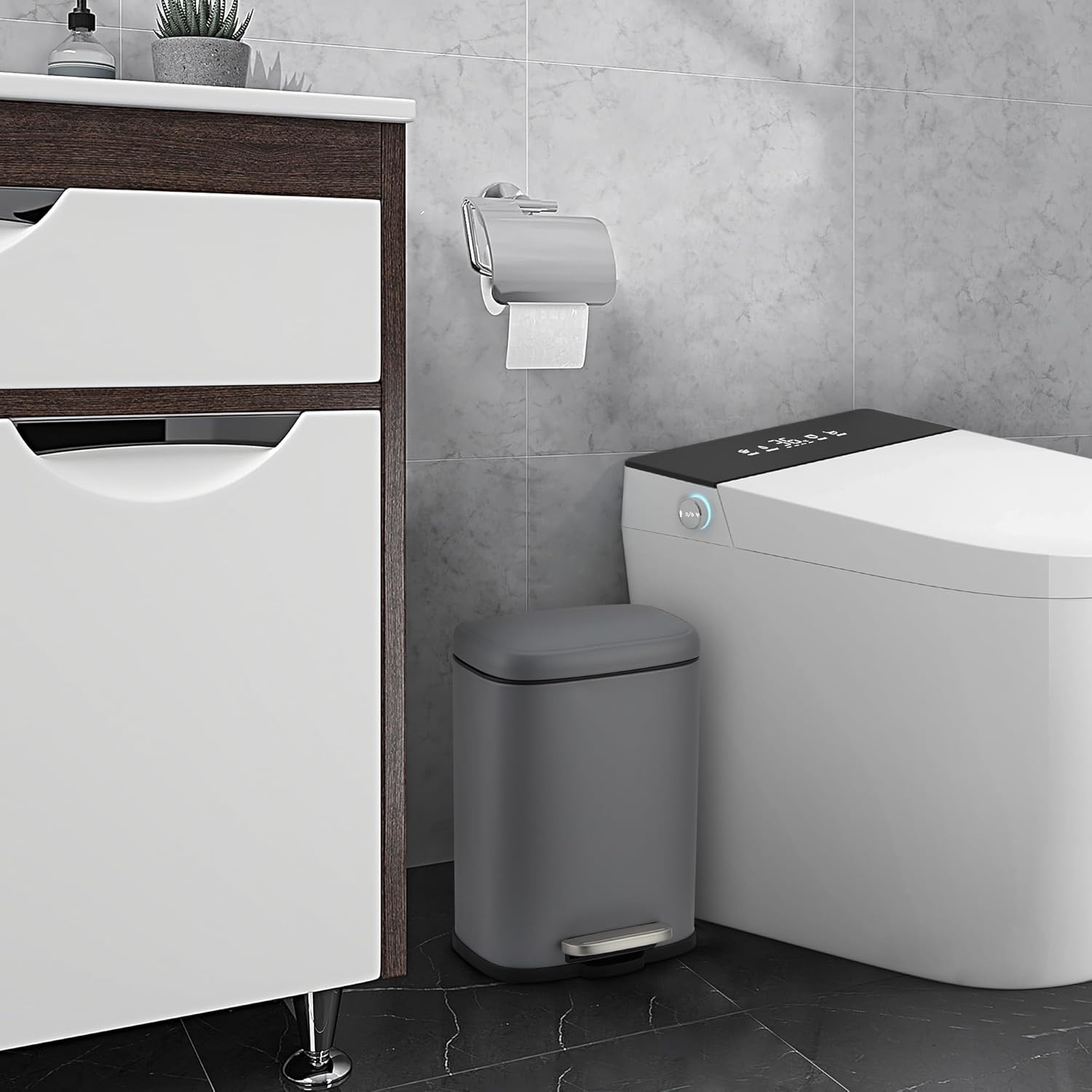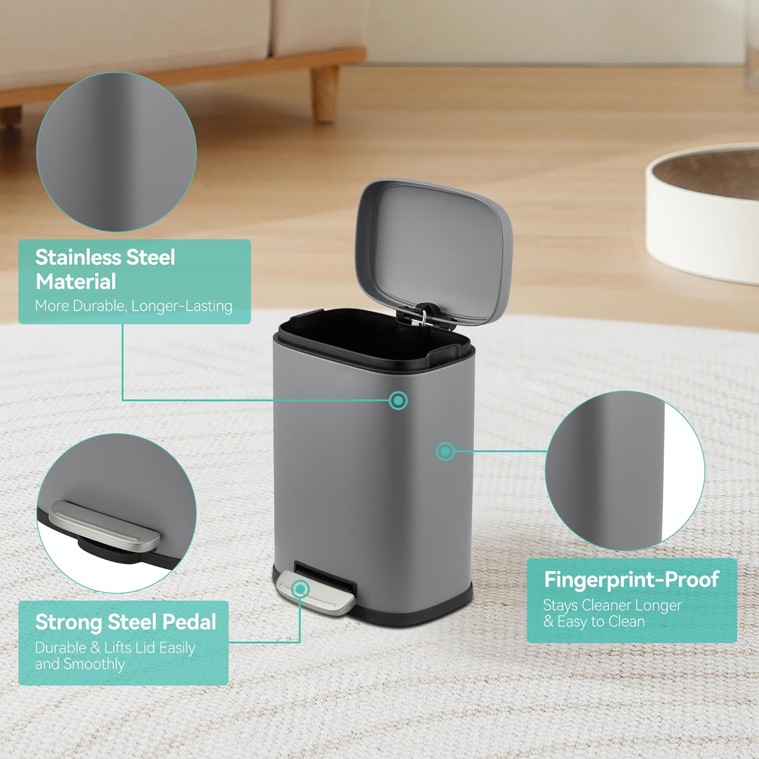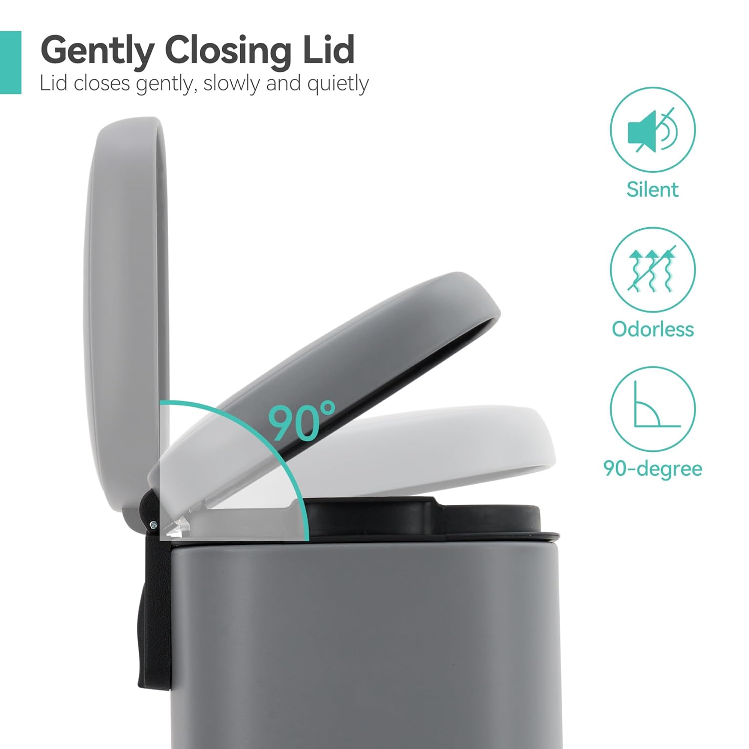 This bin features a stain-resistant brushed stainless steel finish that repels fingerprints and oil, ensuring it remains clean and sleek. The hands-free pedal allows for silent lid operation, while the odor-sealing closure keeps unpleasant smells contained.