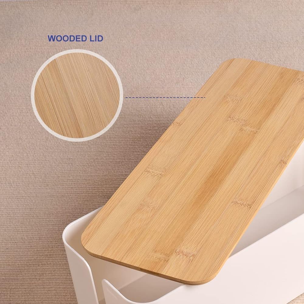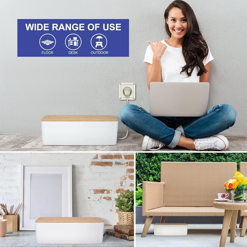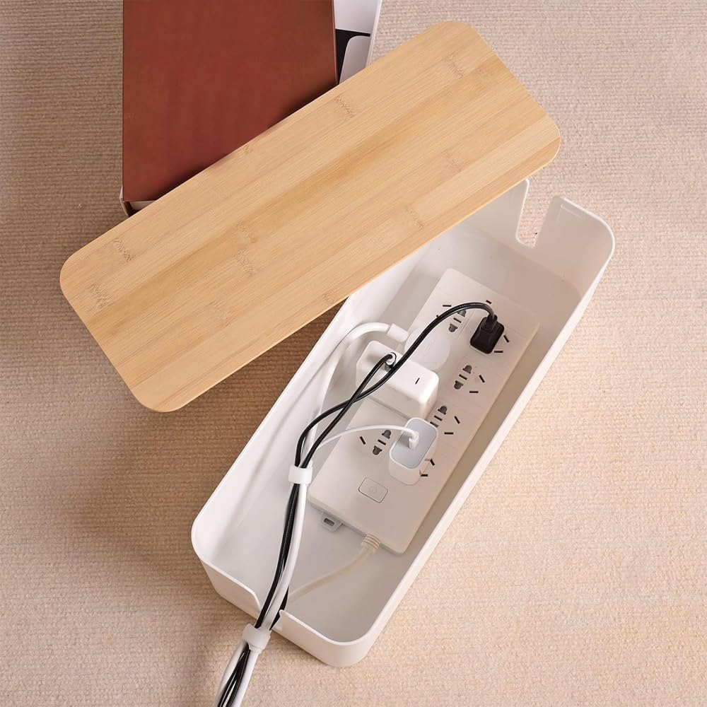 Crafted with a bamboo lid, it not only provides a stylish touch but also effectively hides clutter. This box is suitable for use under desks or near entertainment setups, ensuring a clean and streamlined appearance.