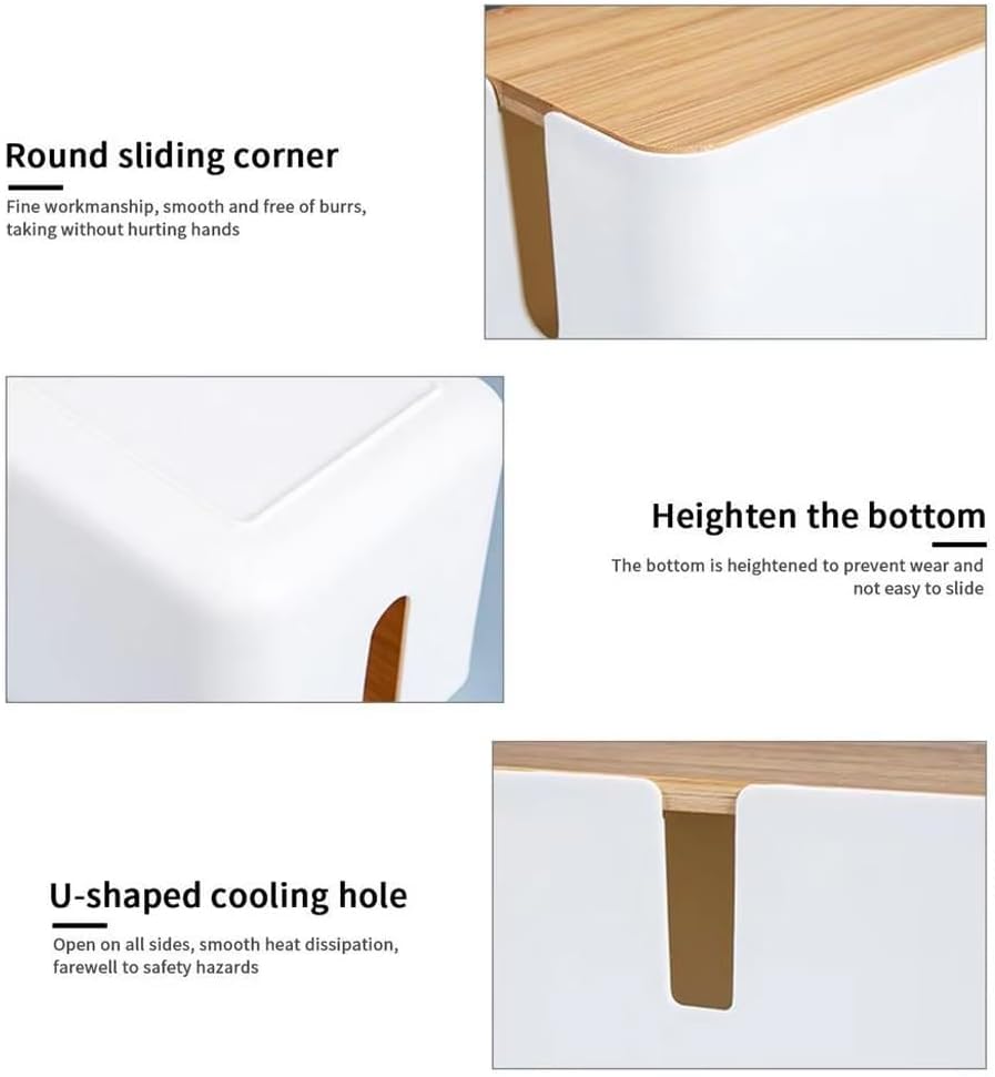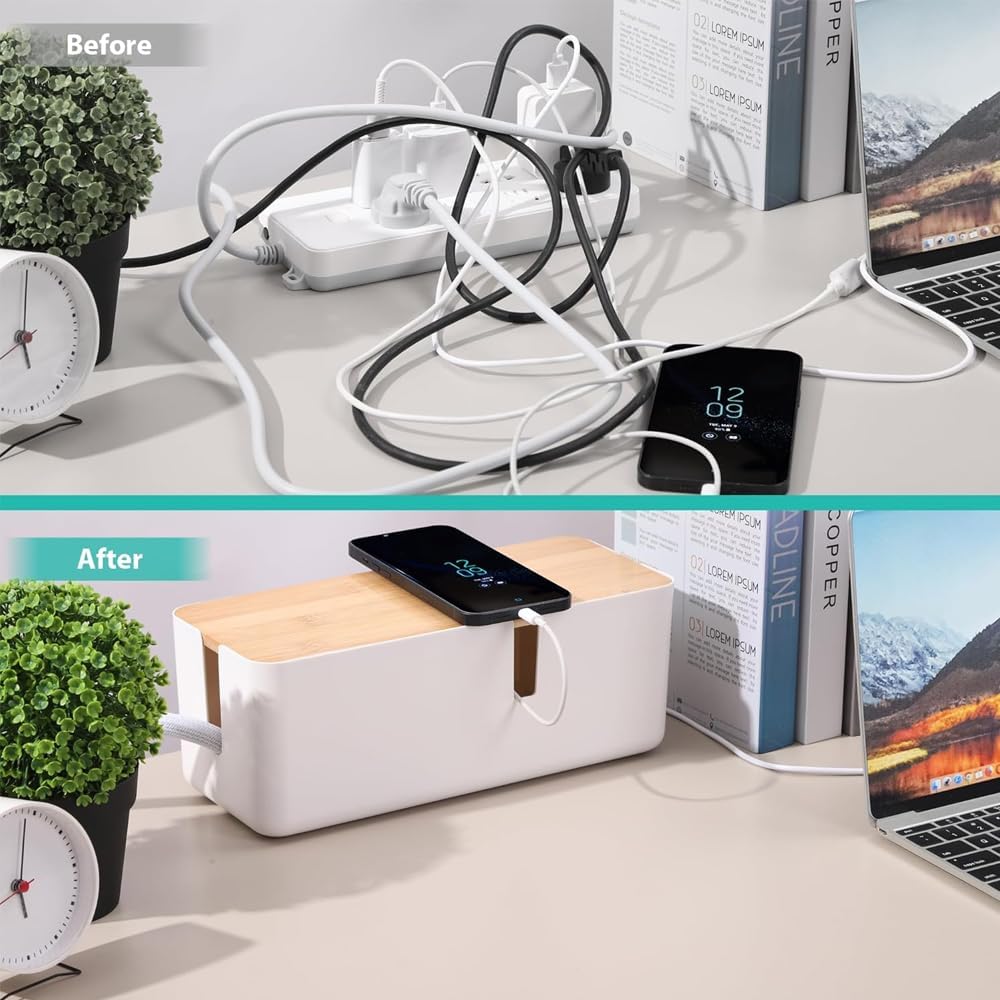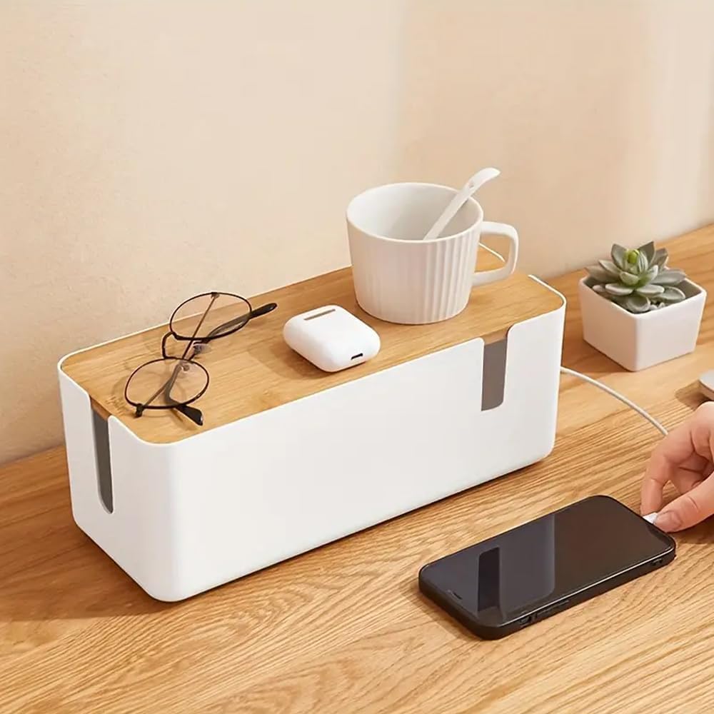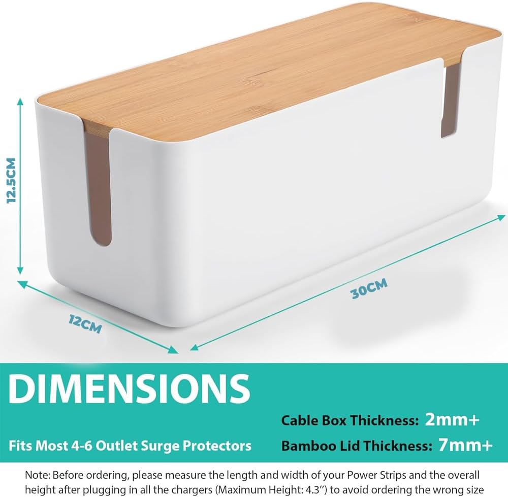 Crafted with a bamboo lid, it not only provides a stylish touch but also effectively hides clutter. This box is suitable for use under desks or near entertainment setups, ensuring a clean and streamlined appearance.
