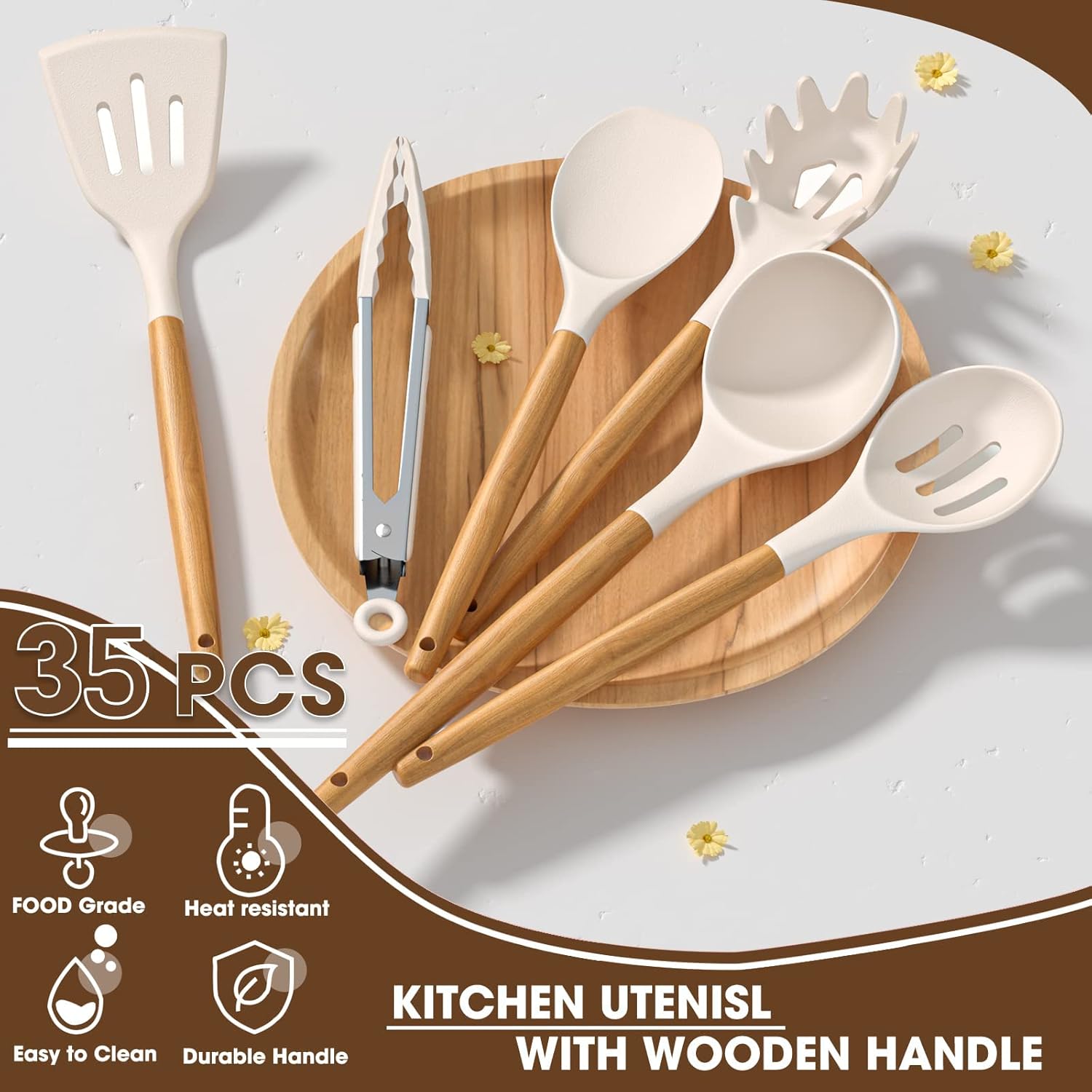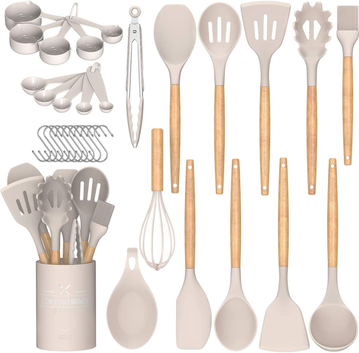 ARCHAEOPTERYX 33 pcs Non-Stick Silicone Cooking Kitchen Utensils Set, Silicone Handle, Heat Resistant, Easy to Clean, Khaki