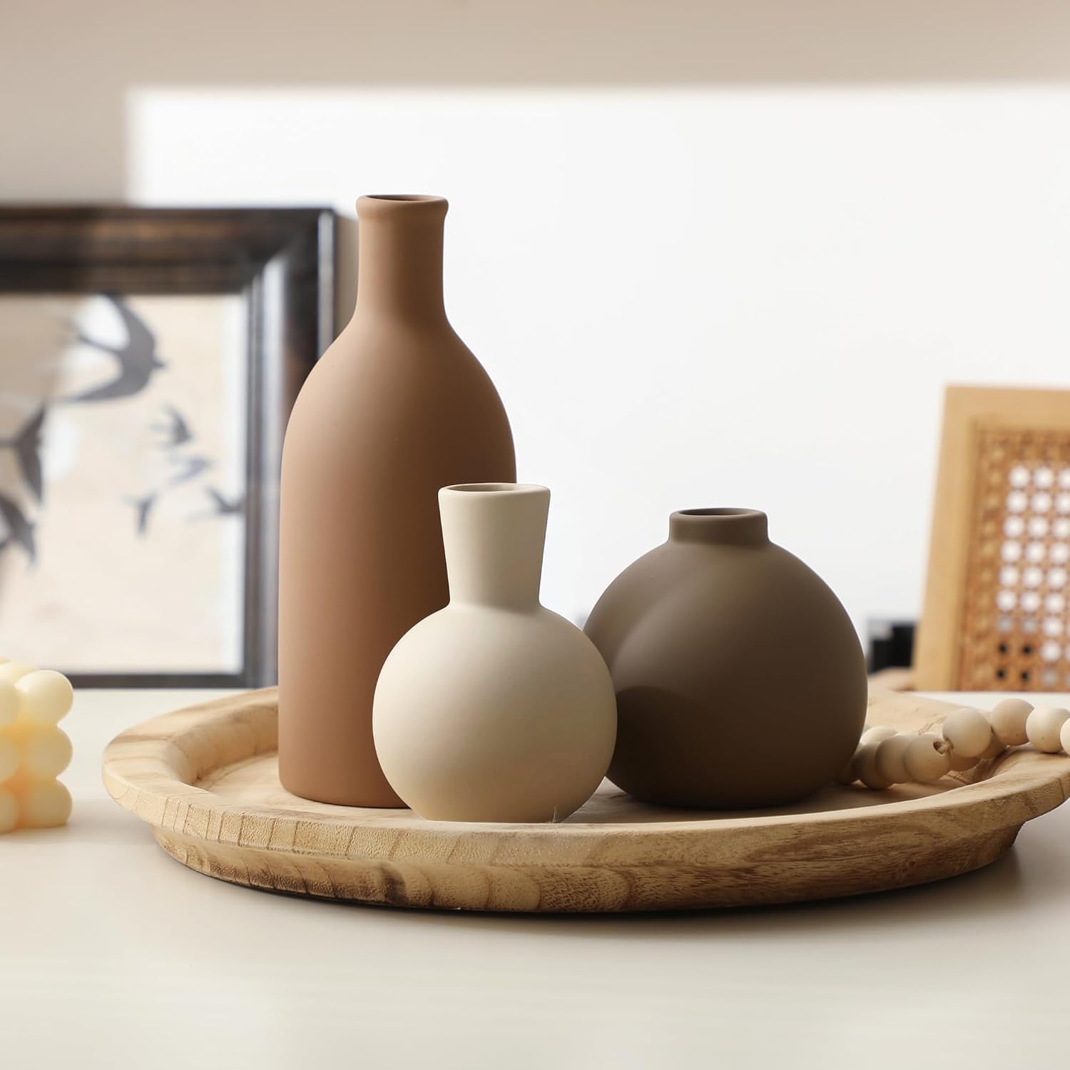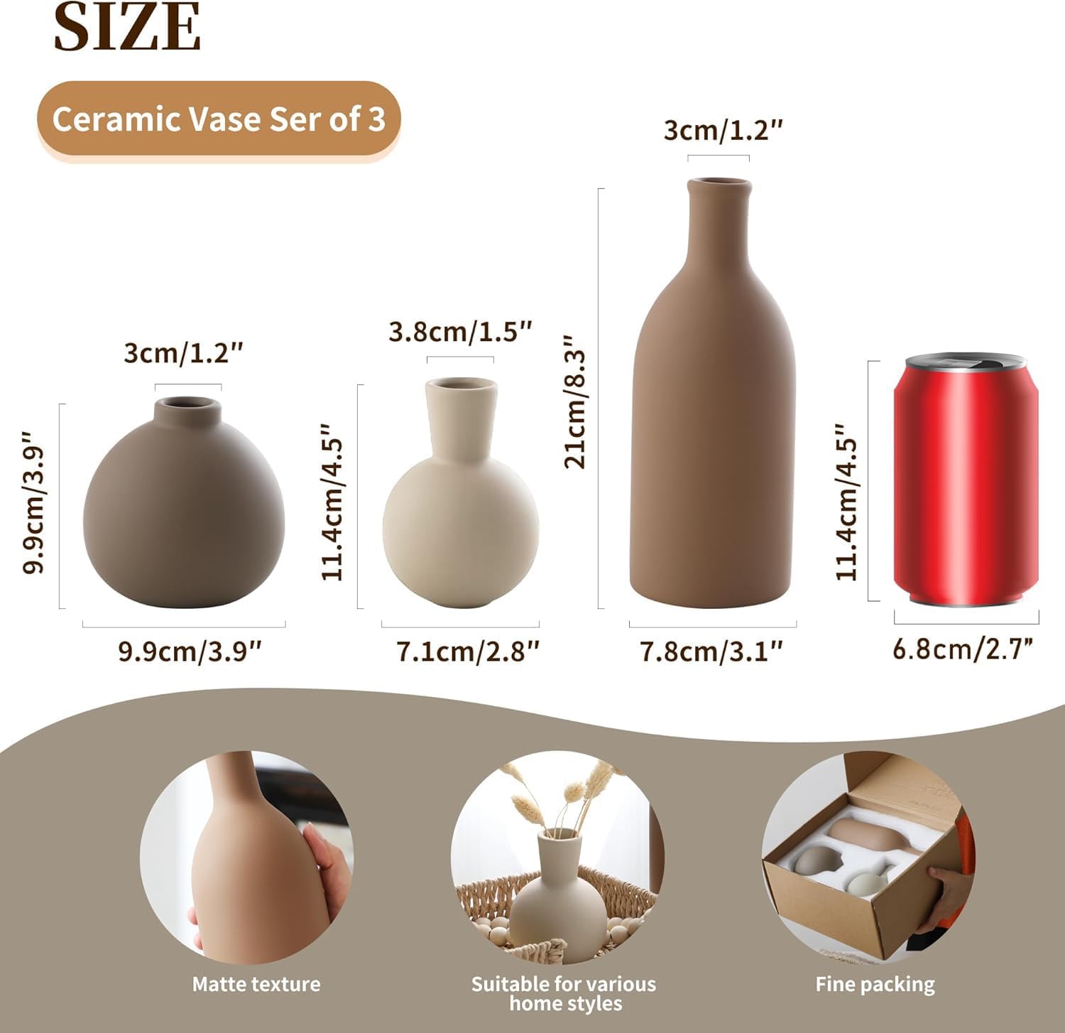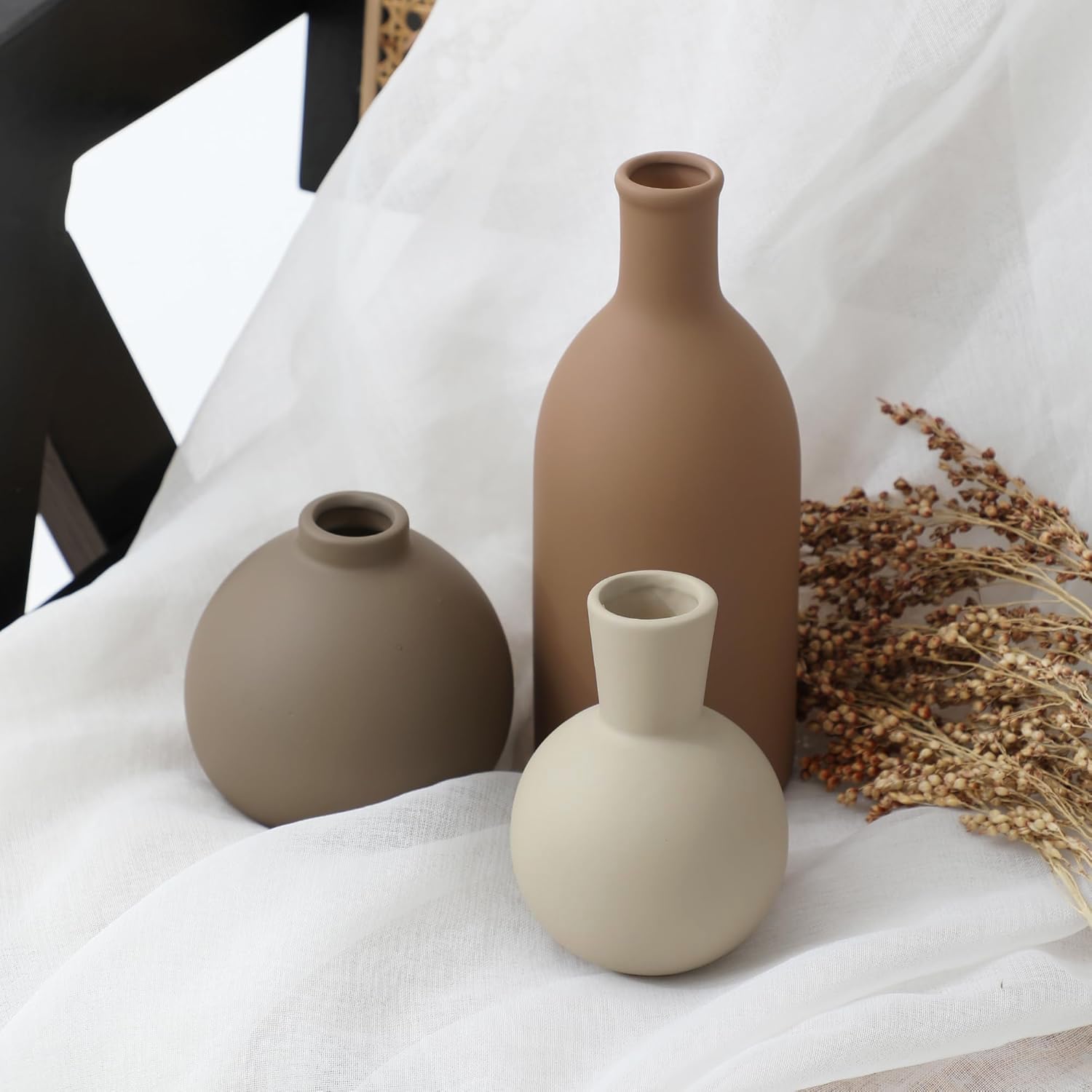 Ceramic Vase Set of 3, Vases Home Decor Rustic Farmhouse Decorative Vase Pottery Vases for Bouquet Pampas Grass Dried Fresh Flowers, Table Living Room Kitchen Bedroom Bathroom – Brown