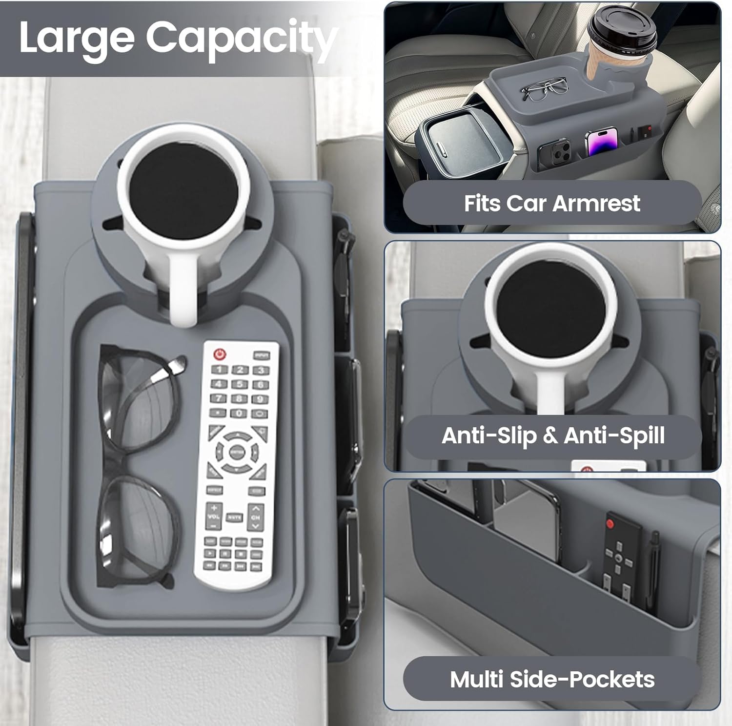 Couch Cup Holder Tray, Silicone Sofa Armrest organizer with Assesory Pockets for storage Remotes, Cell-phone,Tablet or Snack, Anti-Spill and Anti-Slip couch Cup Holder for Drink (Gray)