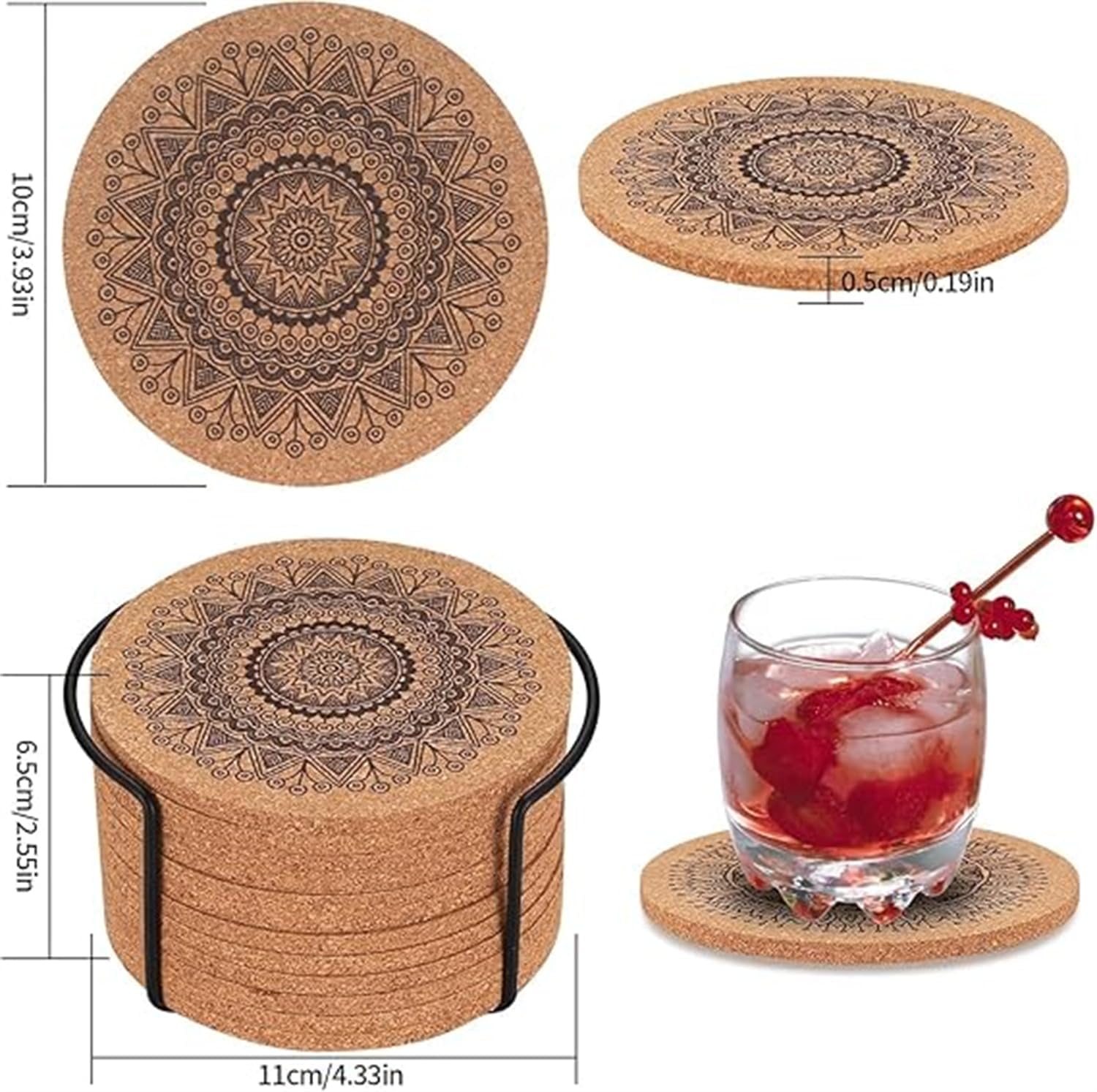 Enhance your living space with this set of 12 Drink Coasters, designed with unique mandala patterns that bring an artistic flair to any environment. Made from natural cork, these coasters are not only eco-friendly but also durable and reusable. Each coaster measures 10cm in diameter and is 5mm thick, providing excellent surface protection against scratches, stains, and heat.
