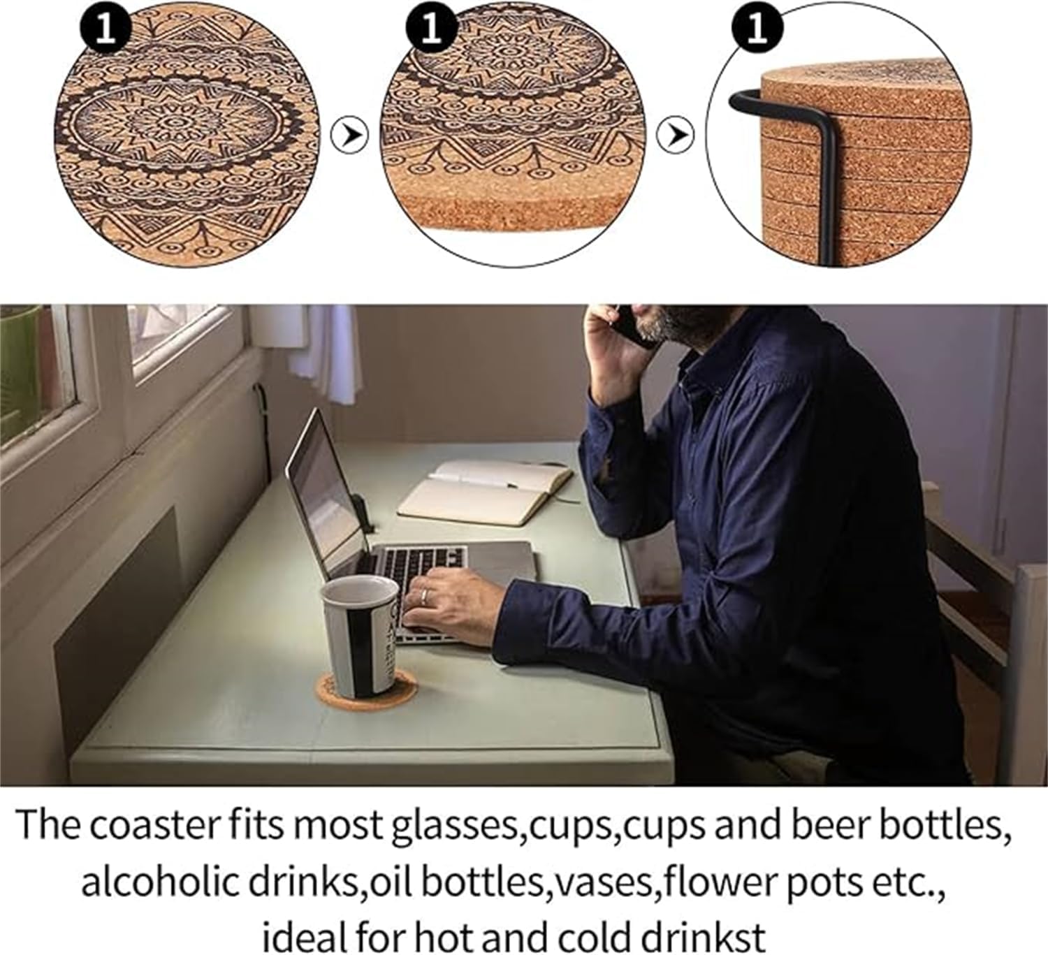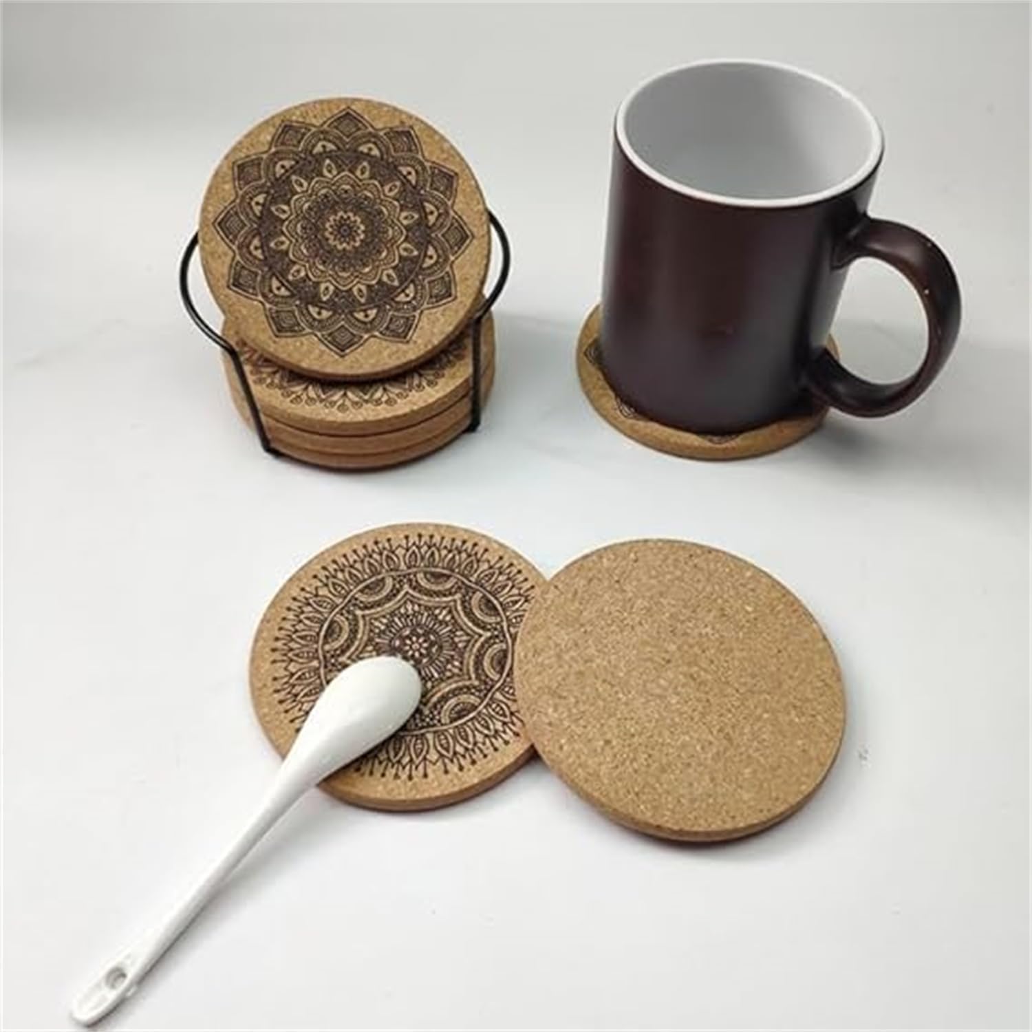 Drink Coasters, Coasters for Cups, Set of 12 with Unique Mandala Patterns Coasters, Cork Coasters, Reusable Cup Mats, for Coffee, Kitchen, home, office, Metal Holder, 10cm Diameter, 5mm Thick