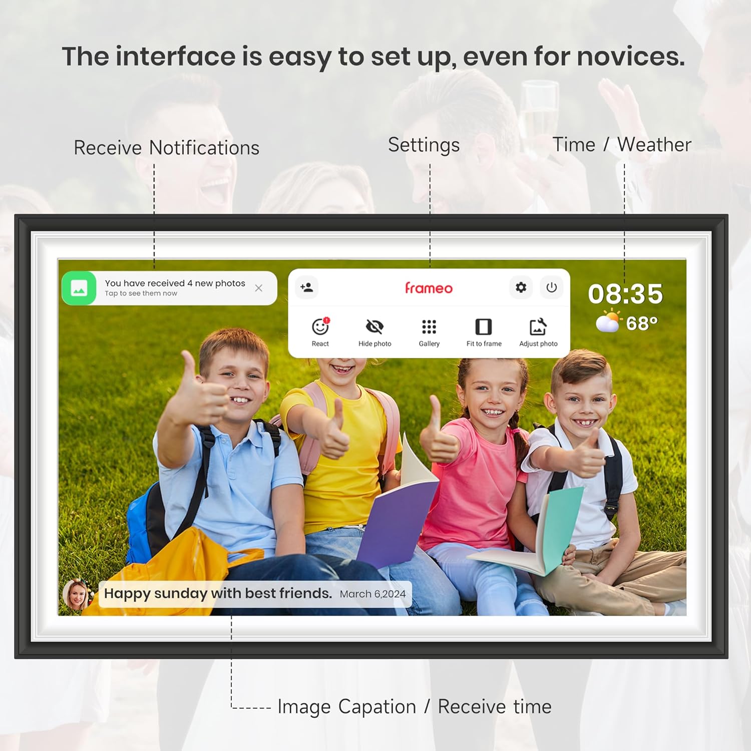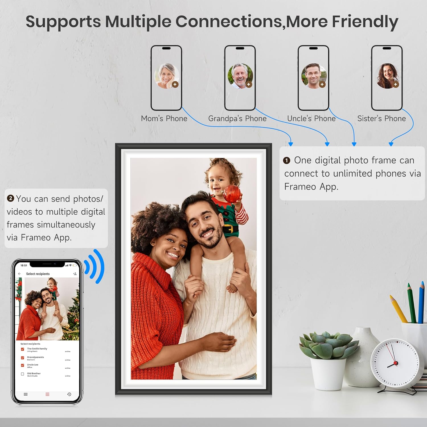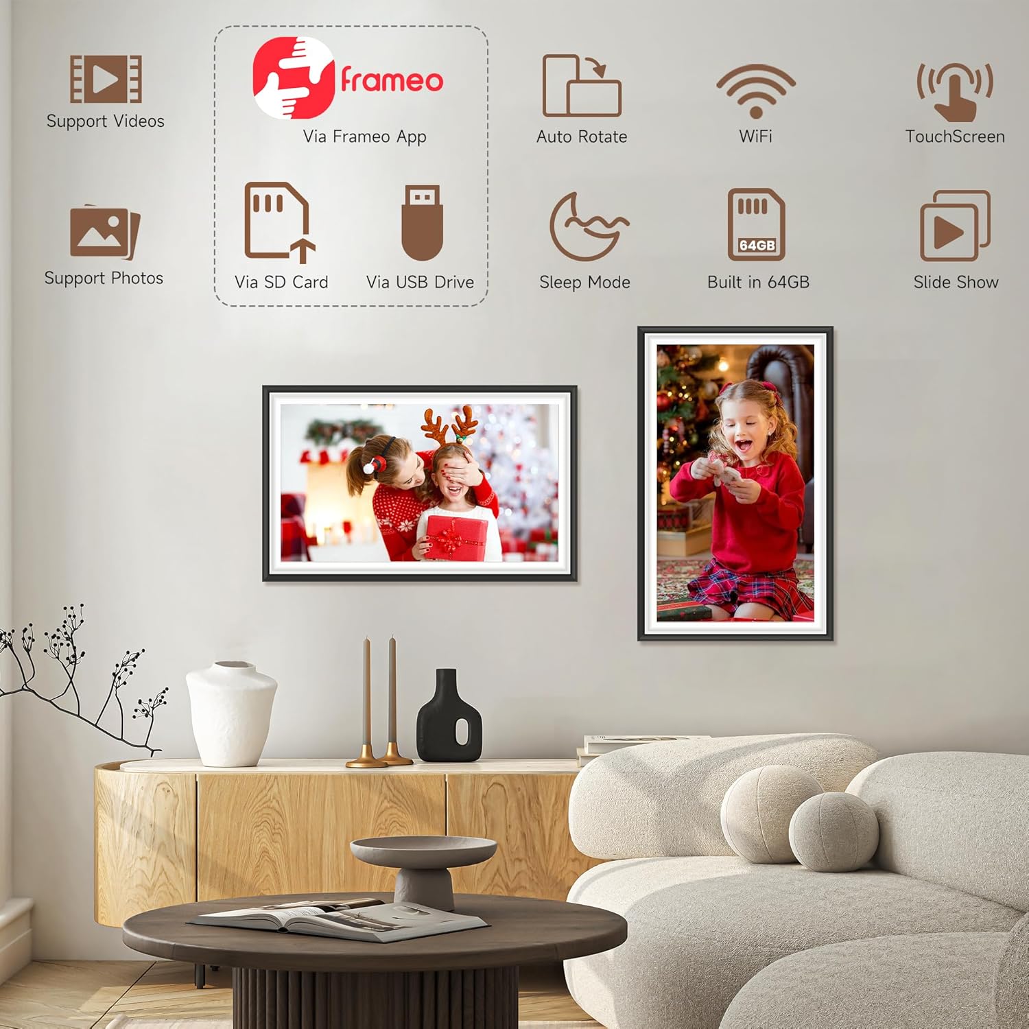 - Easy photo and video sharing via the Frameo app.