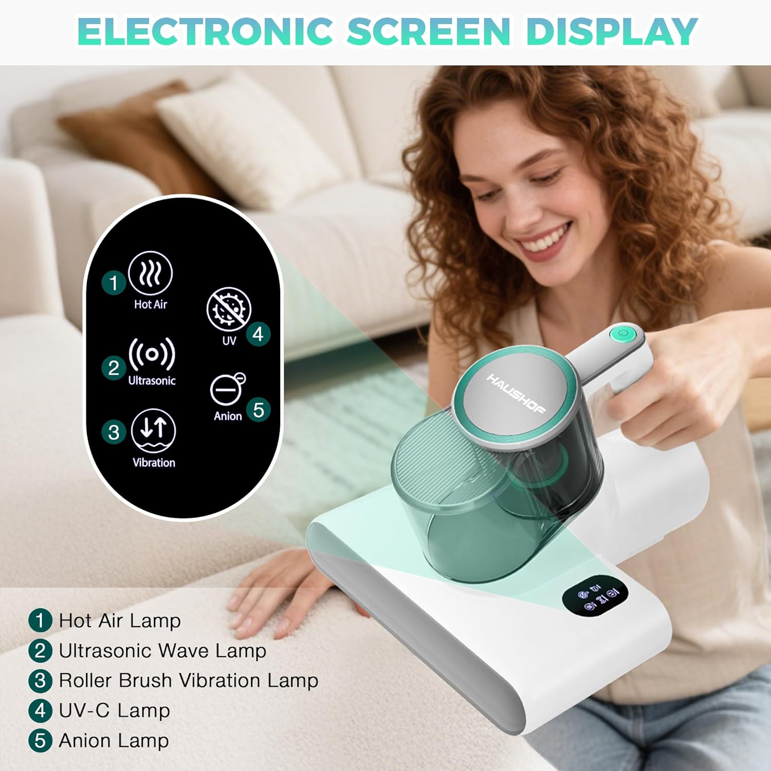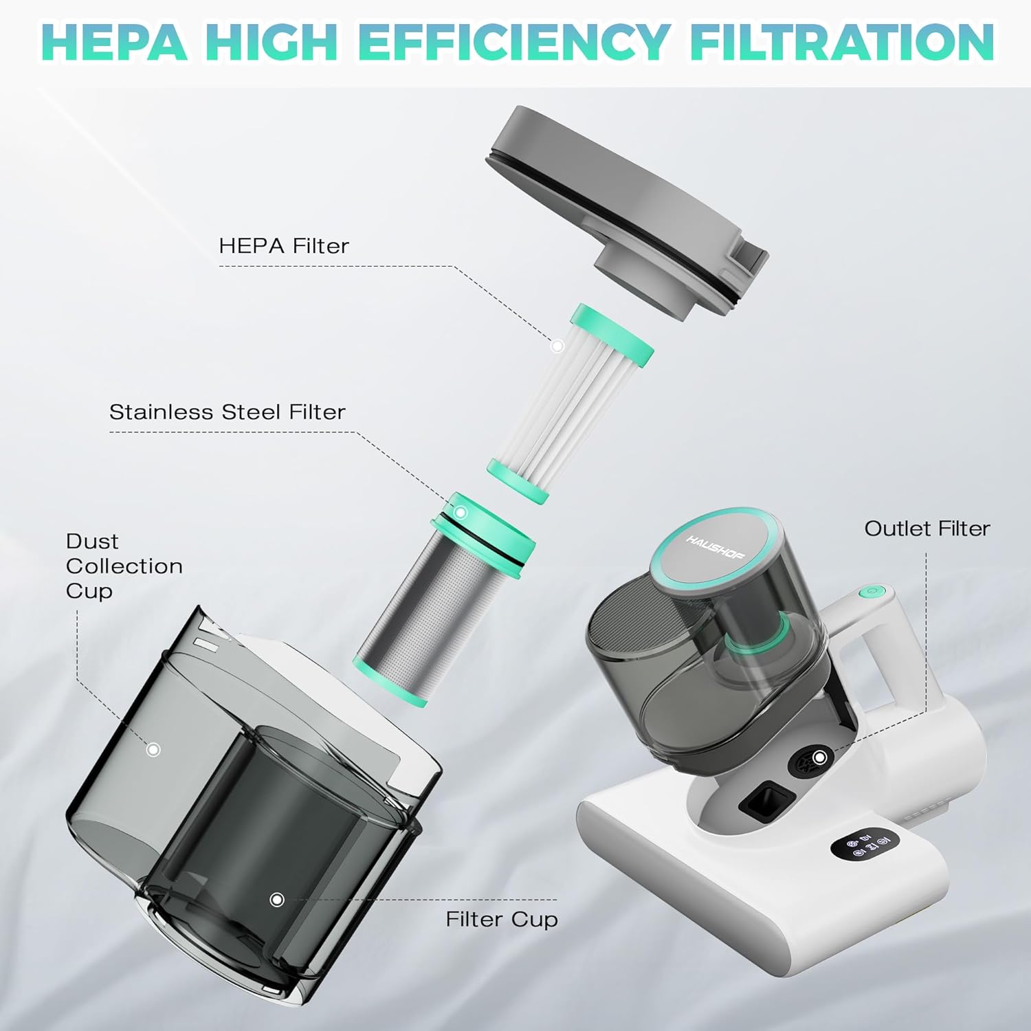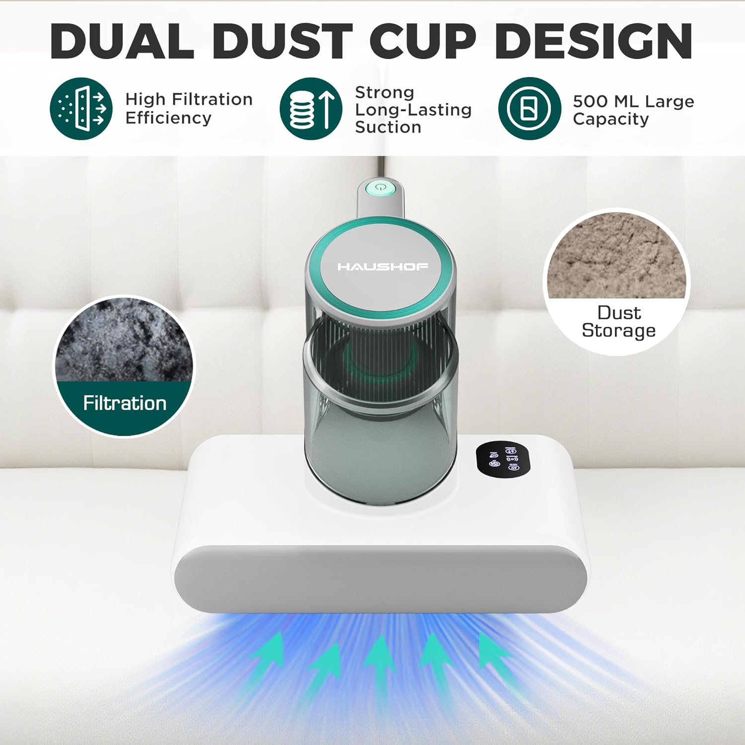 HAUSHOF Mattress Vacuum Cleaner with 275 nm UV Light, Bed Vacuum Cleaner with 16 kPa Suction, Ultrasonic Dual Cup Dust Mite Vacuum Cleaner with HEPA Filter, 60 °C Heat Function for Bed, Sofa