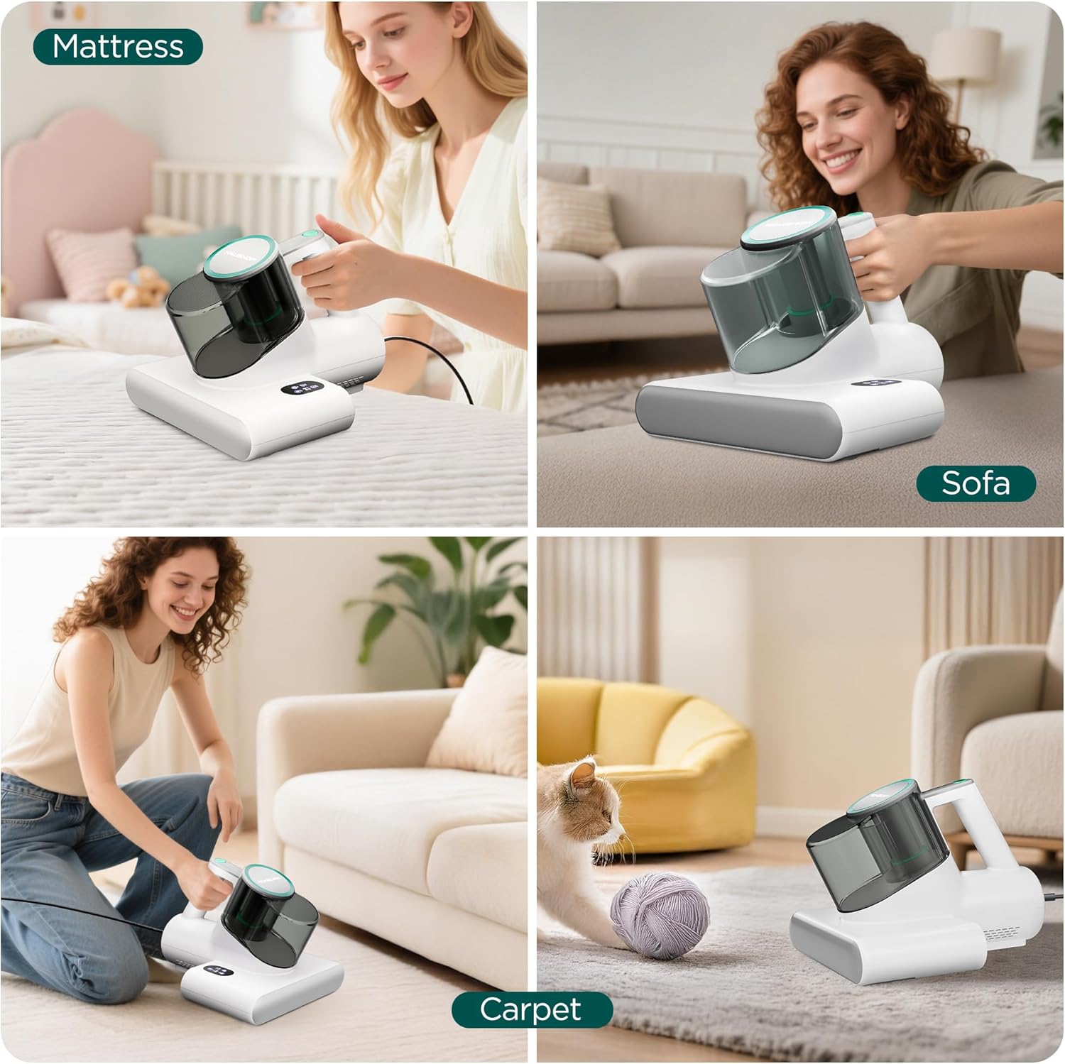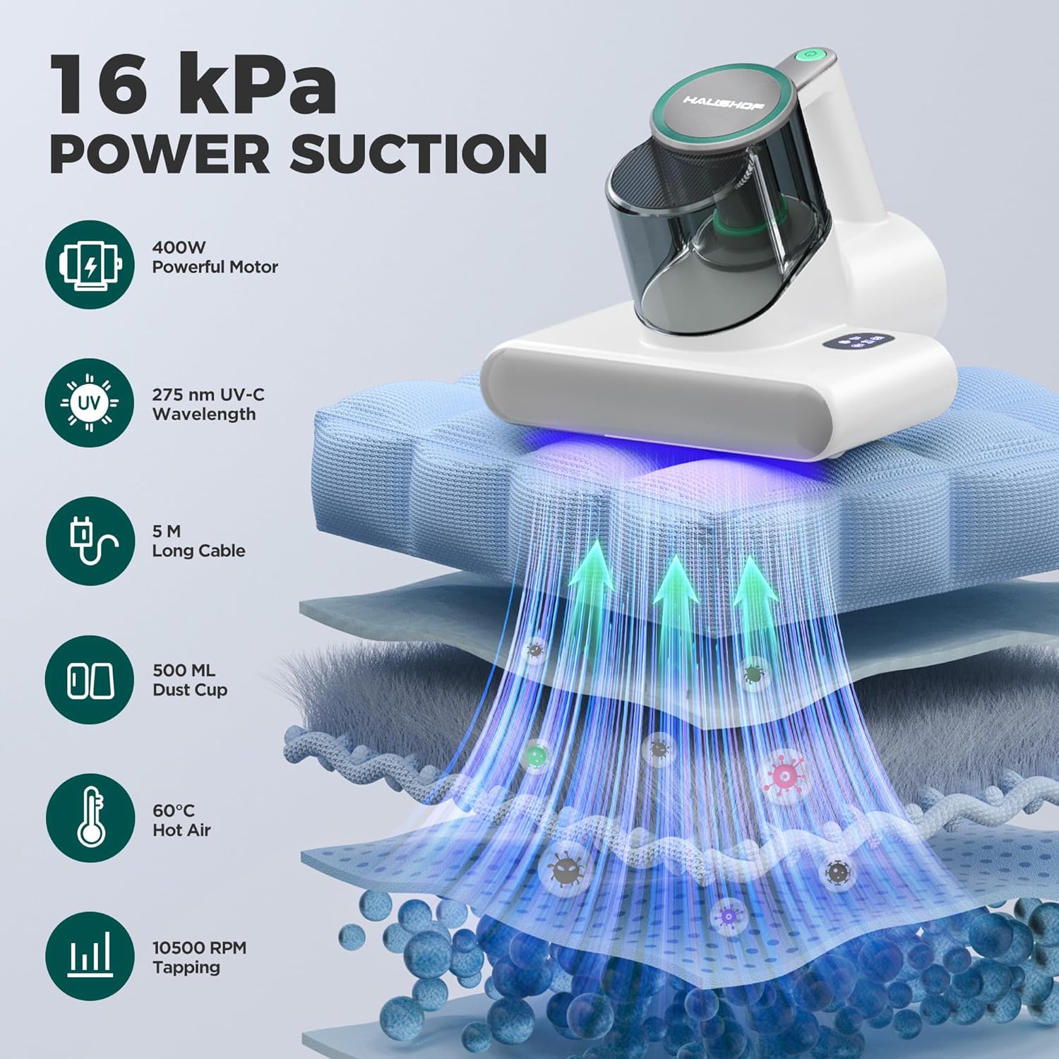The HAUSHOF Mattress Vacuum Cleaner is designed to help maintain a clean and healthy living environment. With its powerful 275 nm UV light and 16 kPa suction, it effectively targets dust mites and allergens in your bedding and upholstery.