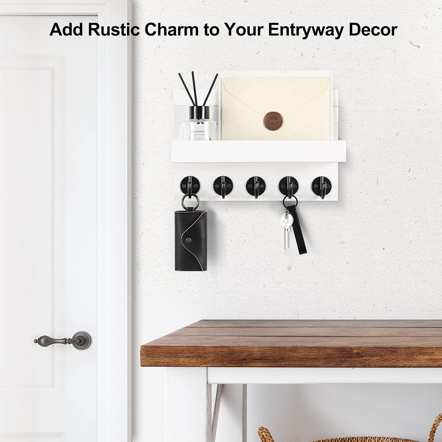 Key Holder Hanger, Decorative Mail Organizer, Wood Hanger With Mounting Hardware, Decorative Mail Holder With Shelf Has Large Key Hooks Coats (White)