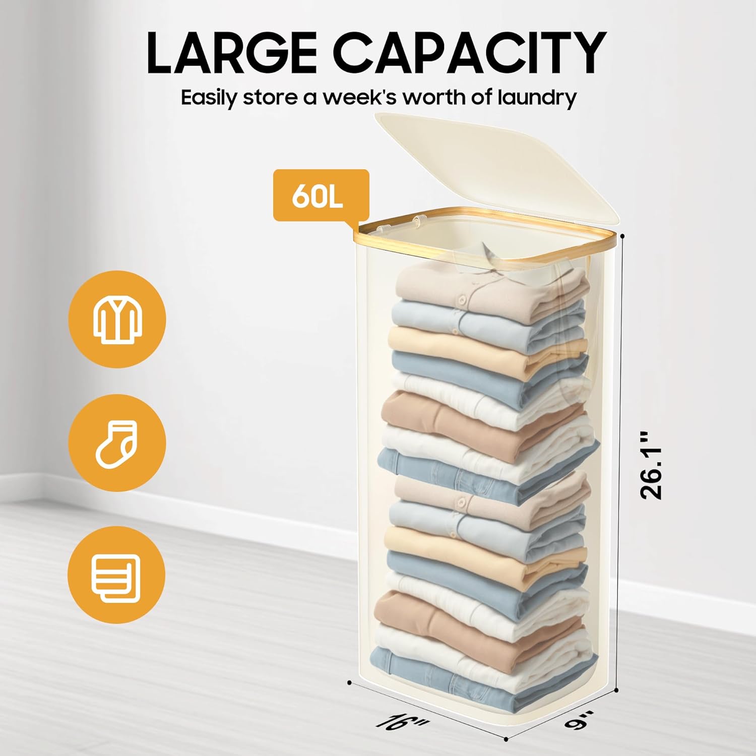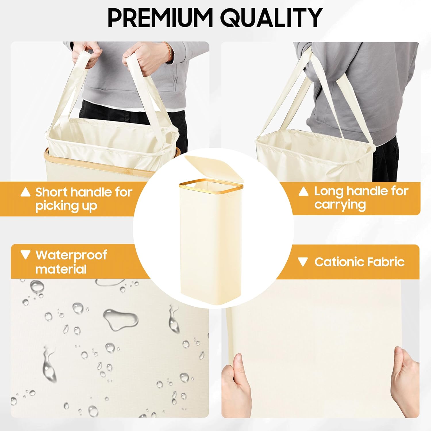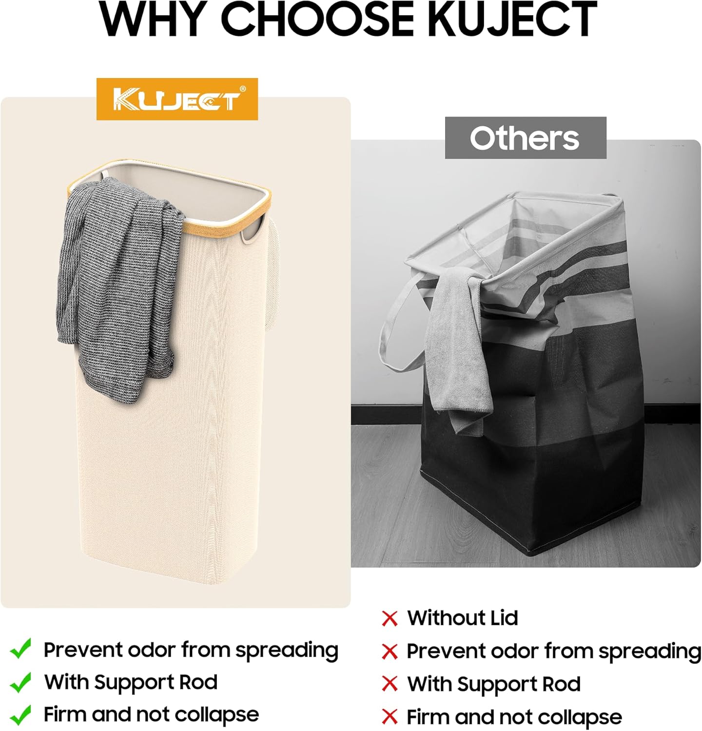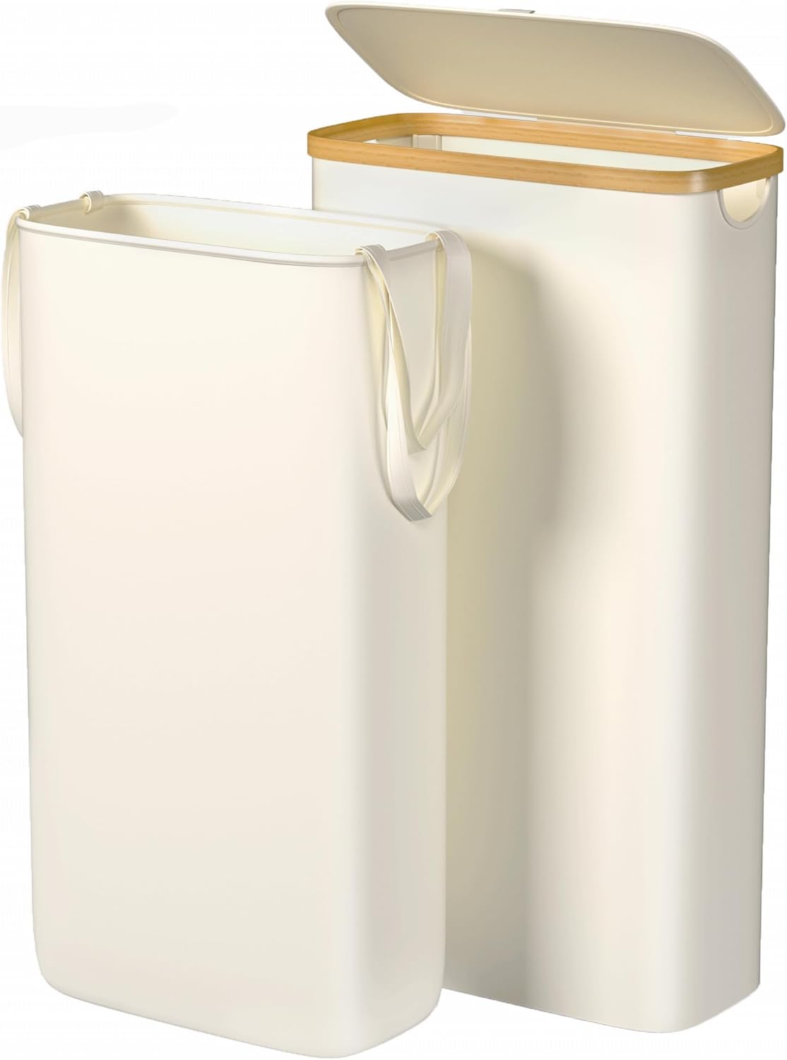 Kuject Laundry Basket with Lid, Waterproof Large Laundry Hamper and Removable Bag, Collapsible Tall Clothes Hamper with Bamboo Handles for Clothes Toys in Dorm Bedroom Bathroom, Black (White, 60L)