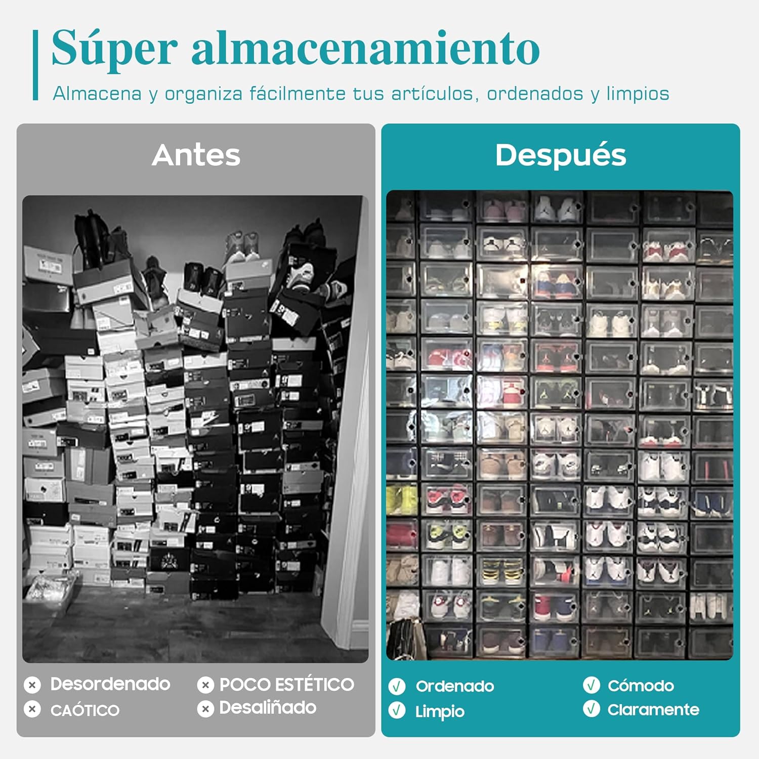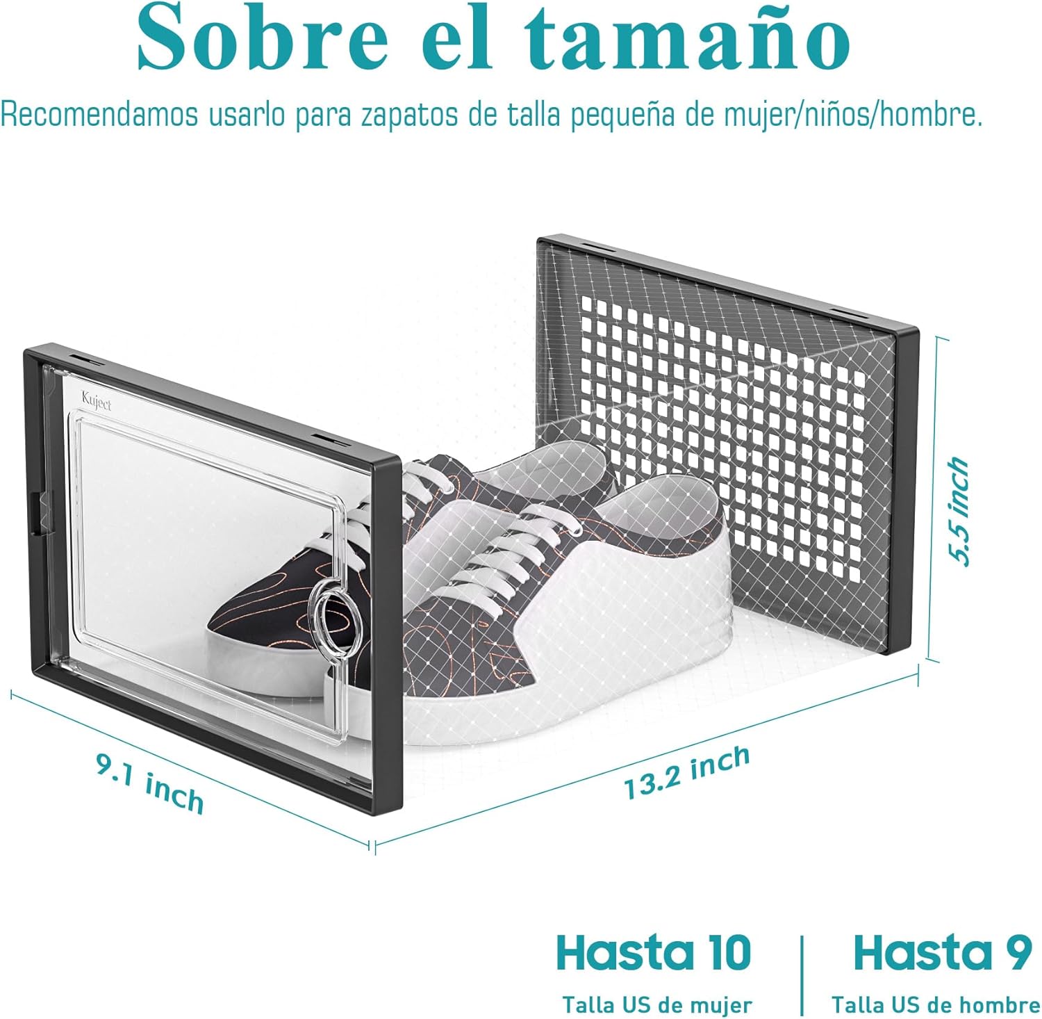 Keep your footwear organized with the Kuject Shoe Organizers Storage Boxes. This set includes 12 clear plastic stackable containers, designed to fit shoes up to women's size 10 and men's size 9. Each box measures 13.2" x 9.1" x 5.5", providing ample space for your favorite pairs.