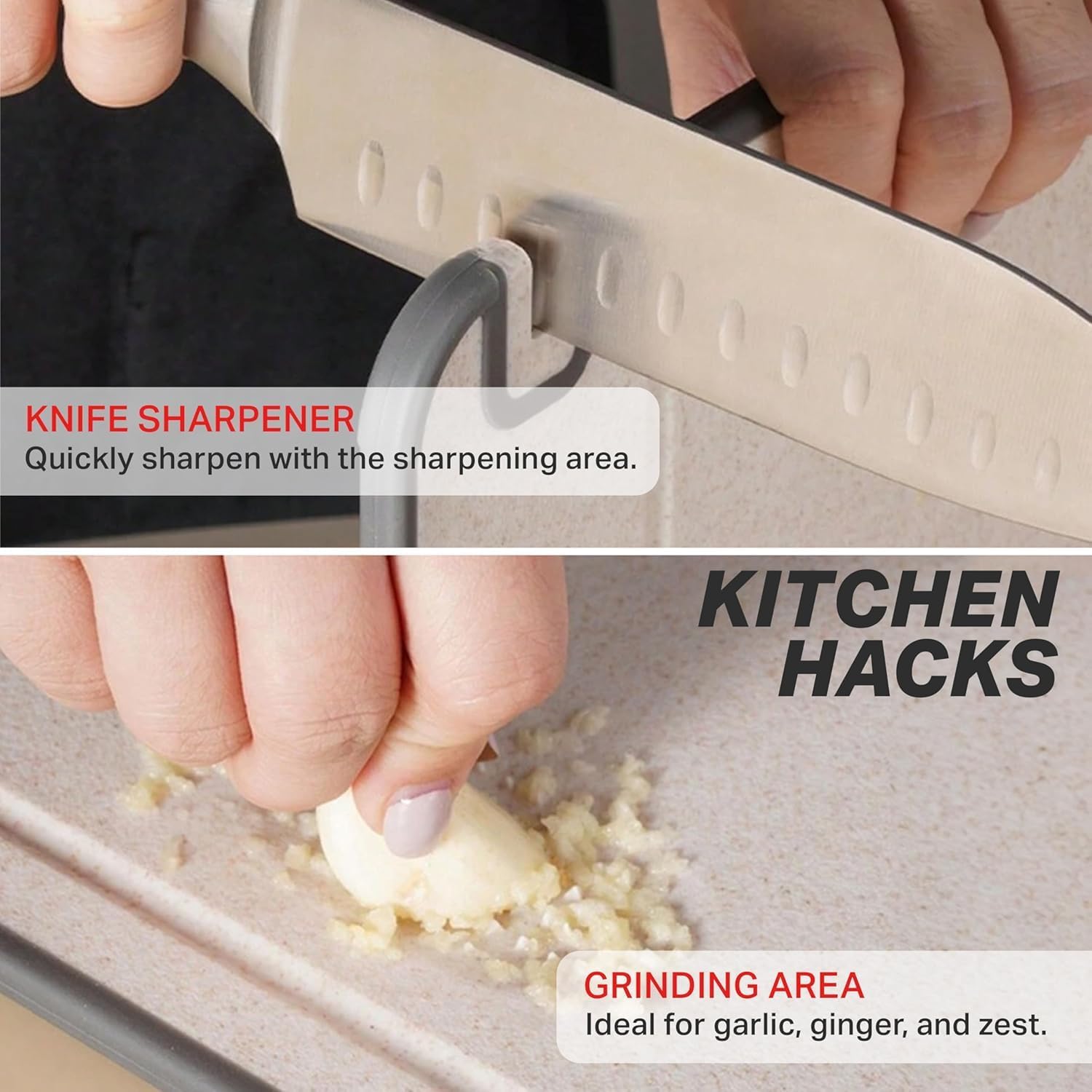 Upgrade your kitchen with our Large Cutting Board, designed for versatility and ease of use. This double-sided board features a built-in knife sharpener, ensuring your knives are always ready for precision cutting. Made from durable wheat straw and stainless steel 304, it offers a sturdy surface for all your food preparation needs.