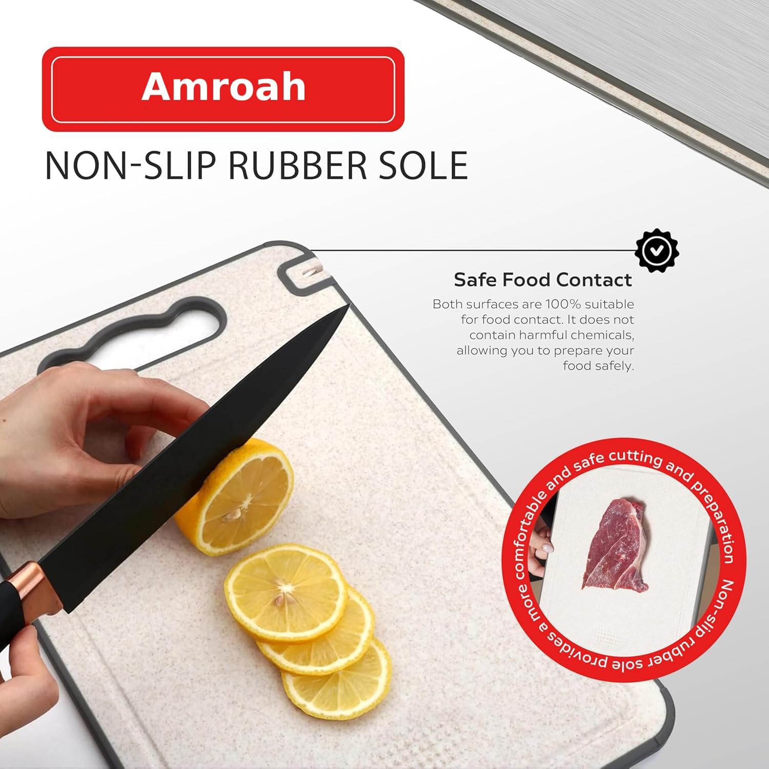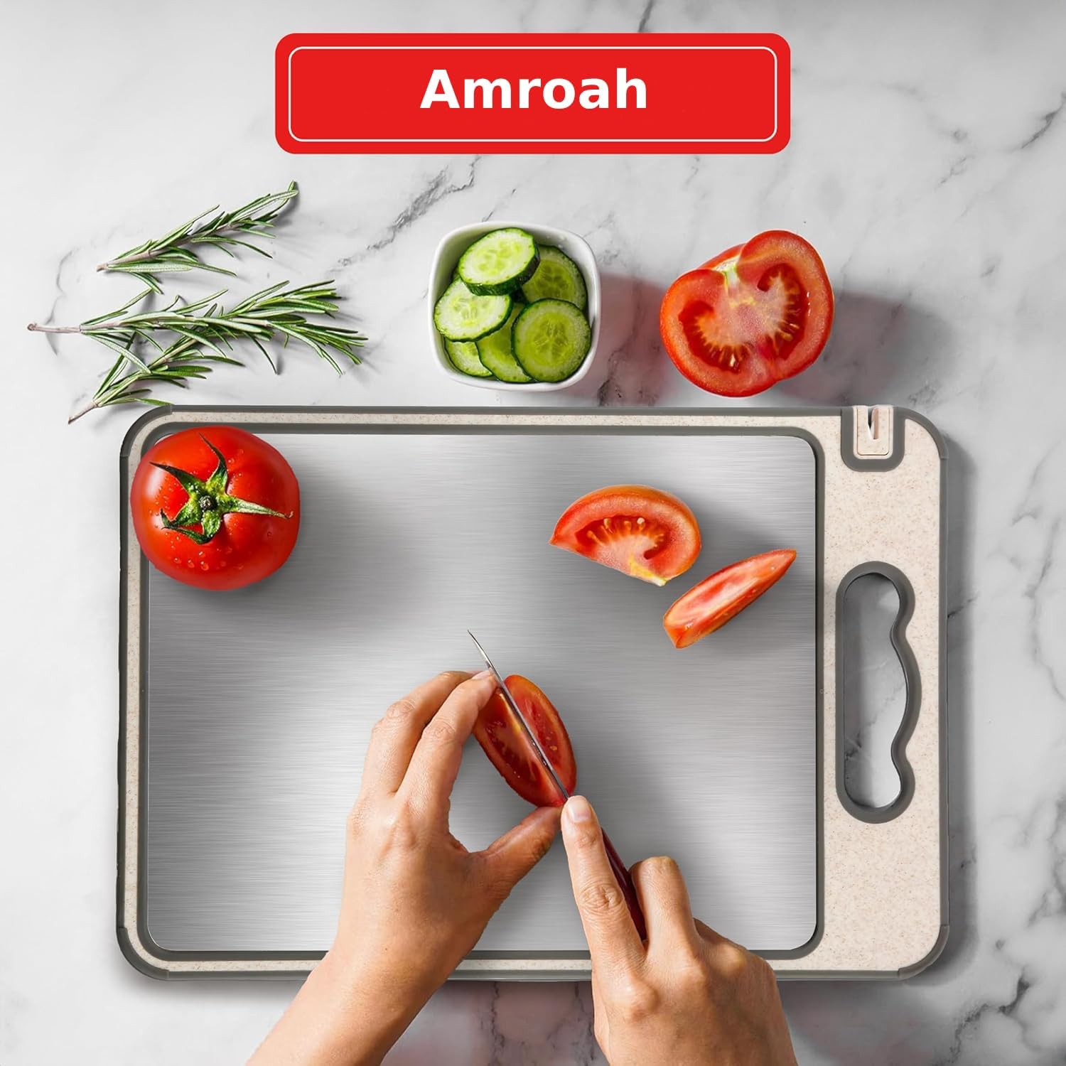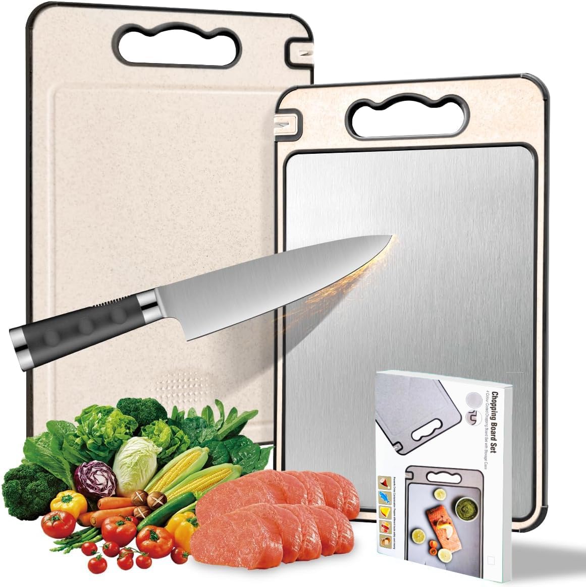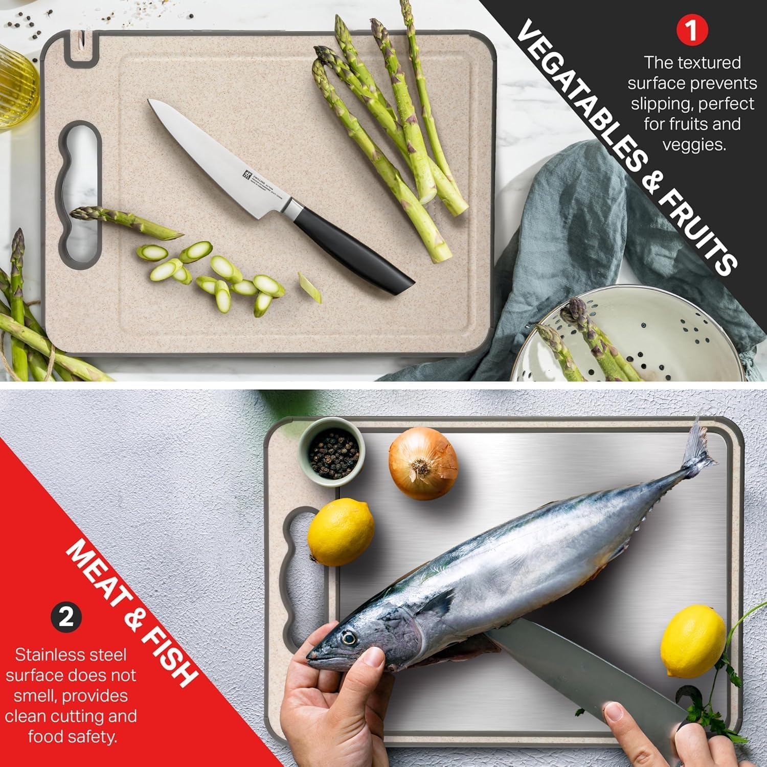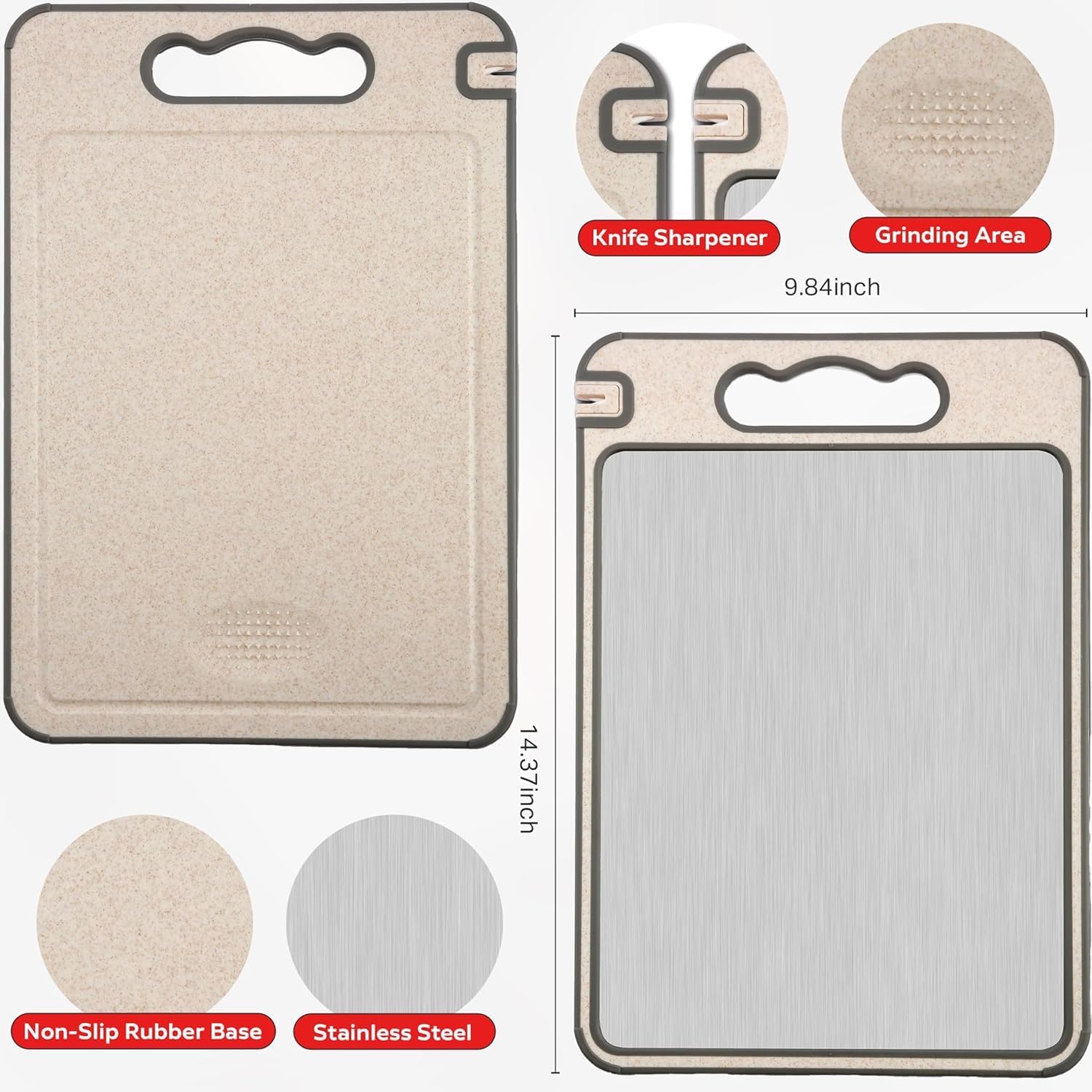 Large Cutting Board Double Sided with a Built-in Knife Sharpener Wheat Straw & Stainless Steel 304, Big Non-Slip Kitchen Chopping Board with Handless for Meat Bread Cheese Vegetable Chiken BBQ