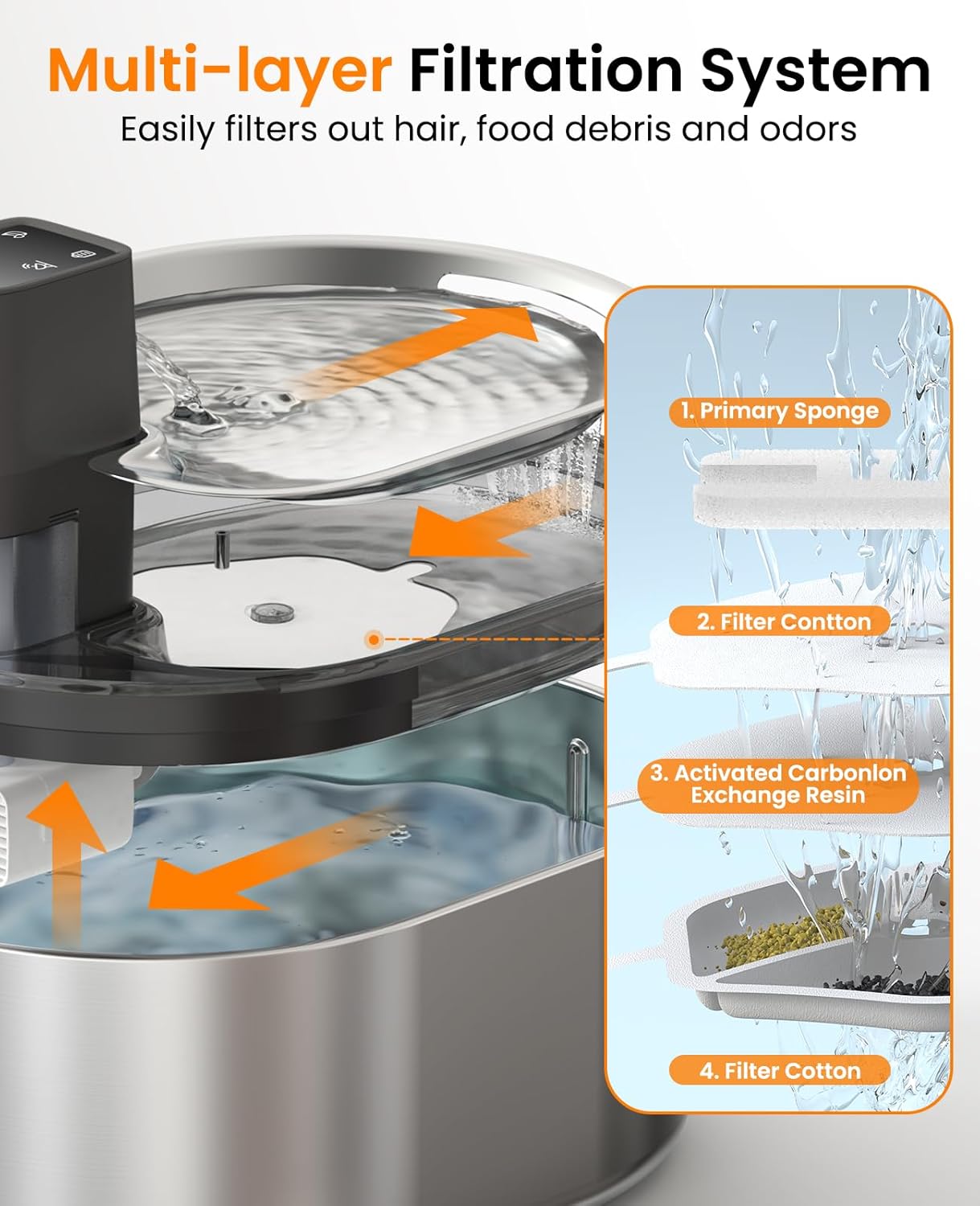 With a powerful 3000mAh rechargeable battery, this fountain can operate for up to 60 days on a full charge, making it both convenient and efficient. The water level window and LED light provide easy visibility of the water level, day or night.