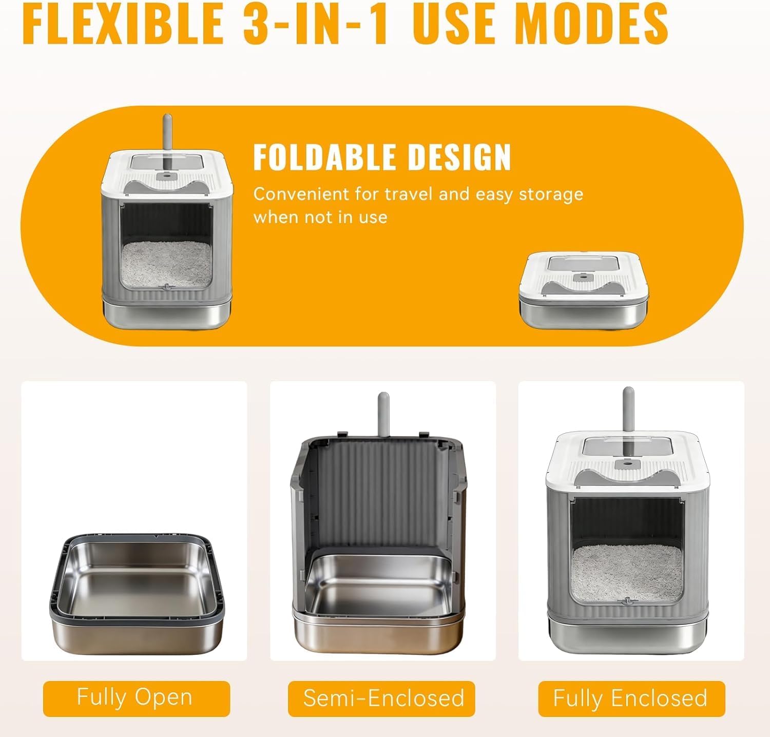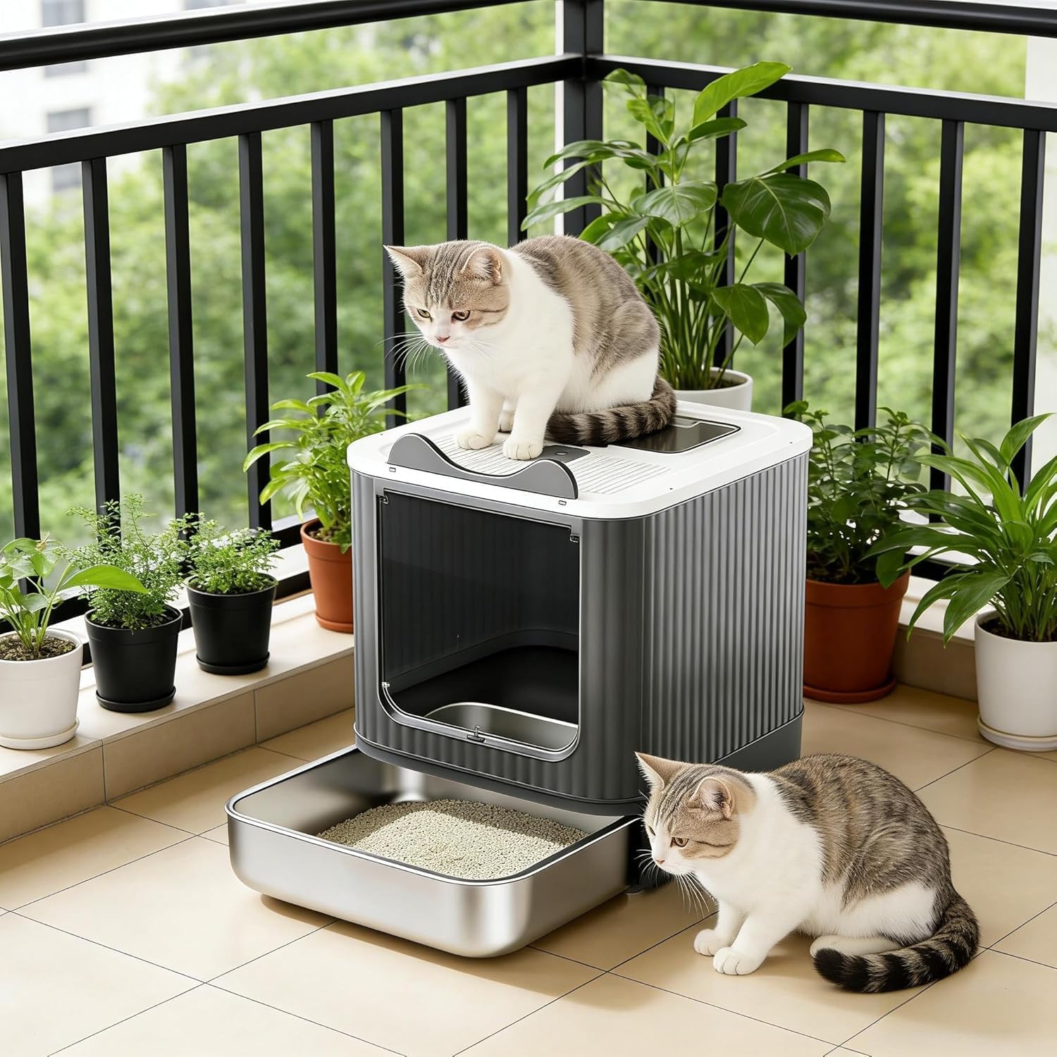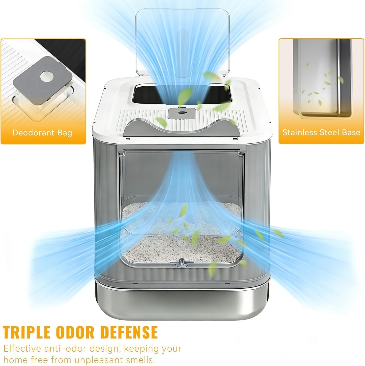 This litter box features an enclosed layout with a one-way design that allows for easy access while keeping odors and litter contained. The self-closing front entryway effectively minimizes mess and helps maintain a tidy space.