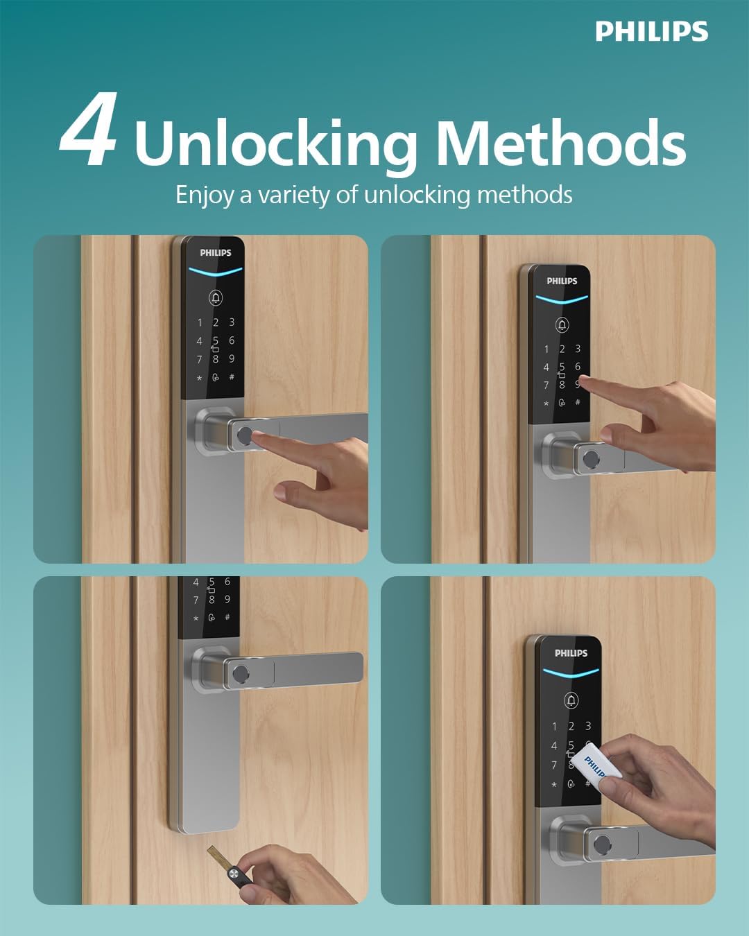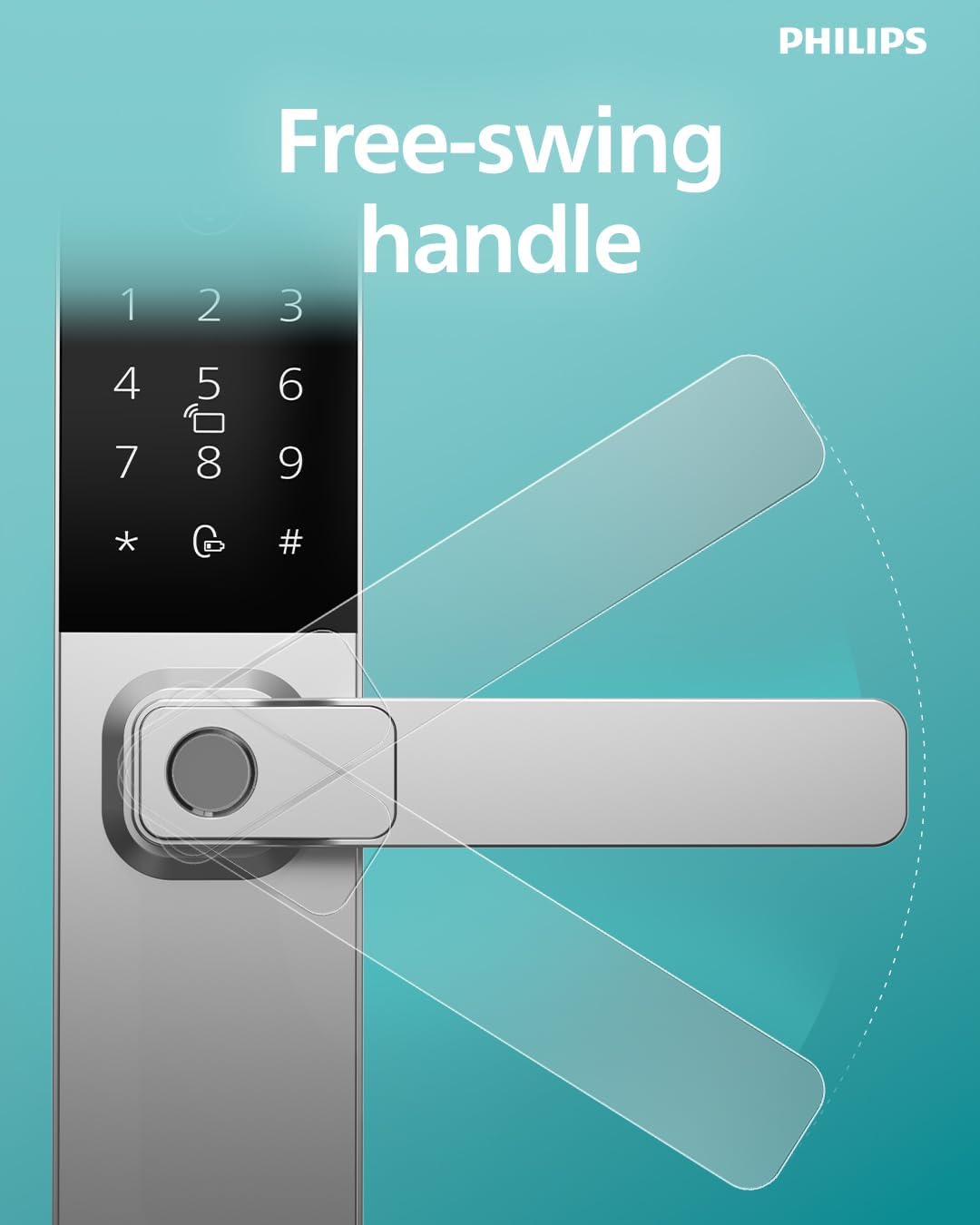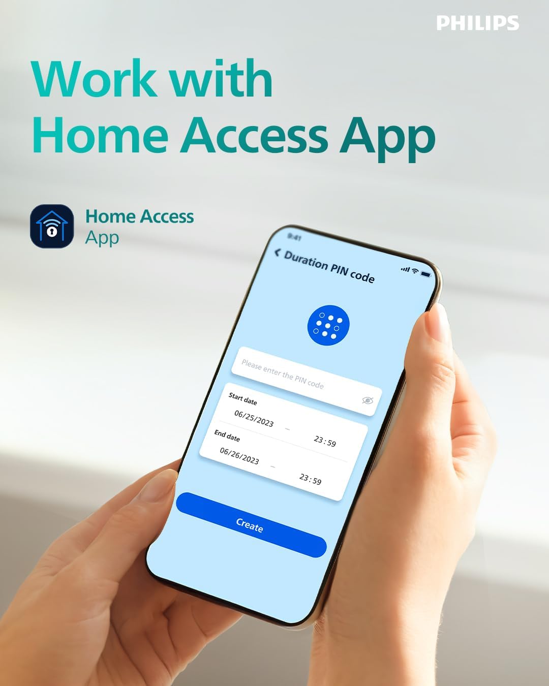 Integration with the Philips Home Access ecosystem enhances your security monitoring capabilities. This smart lock supports multiple access methods, including fingerprint recognition, PIN codes, and app control, providing versatile entry options.