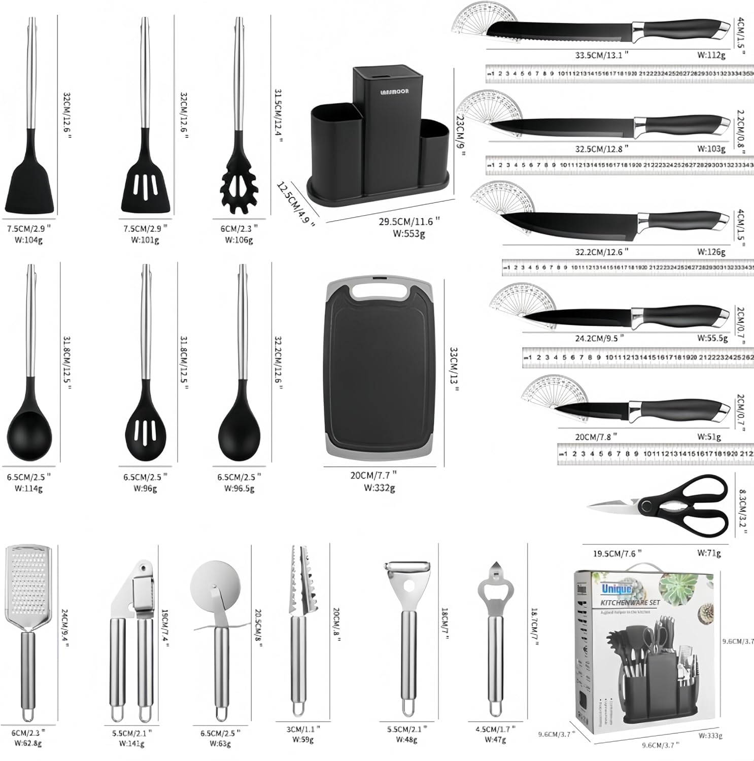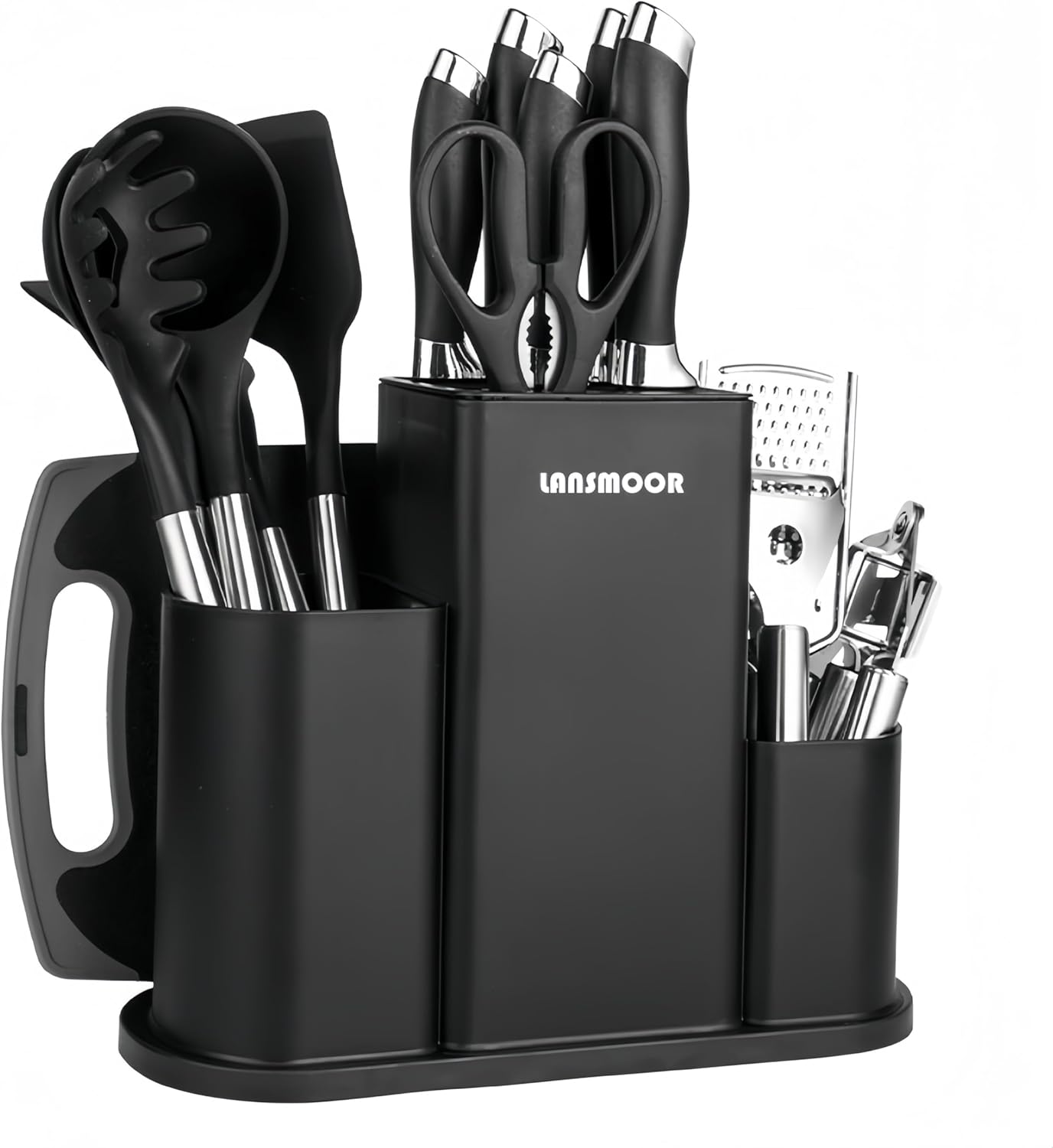 Premium 20pcs Kitchen Utensil Set, Cooking chef Tools with Storage Rack, Includes Knives, Cutting Board, Kitchen Accessories, BPA-Free, Non-toxic Silicone Kitchenware(Black)