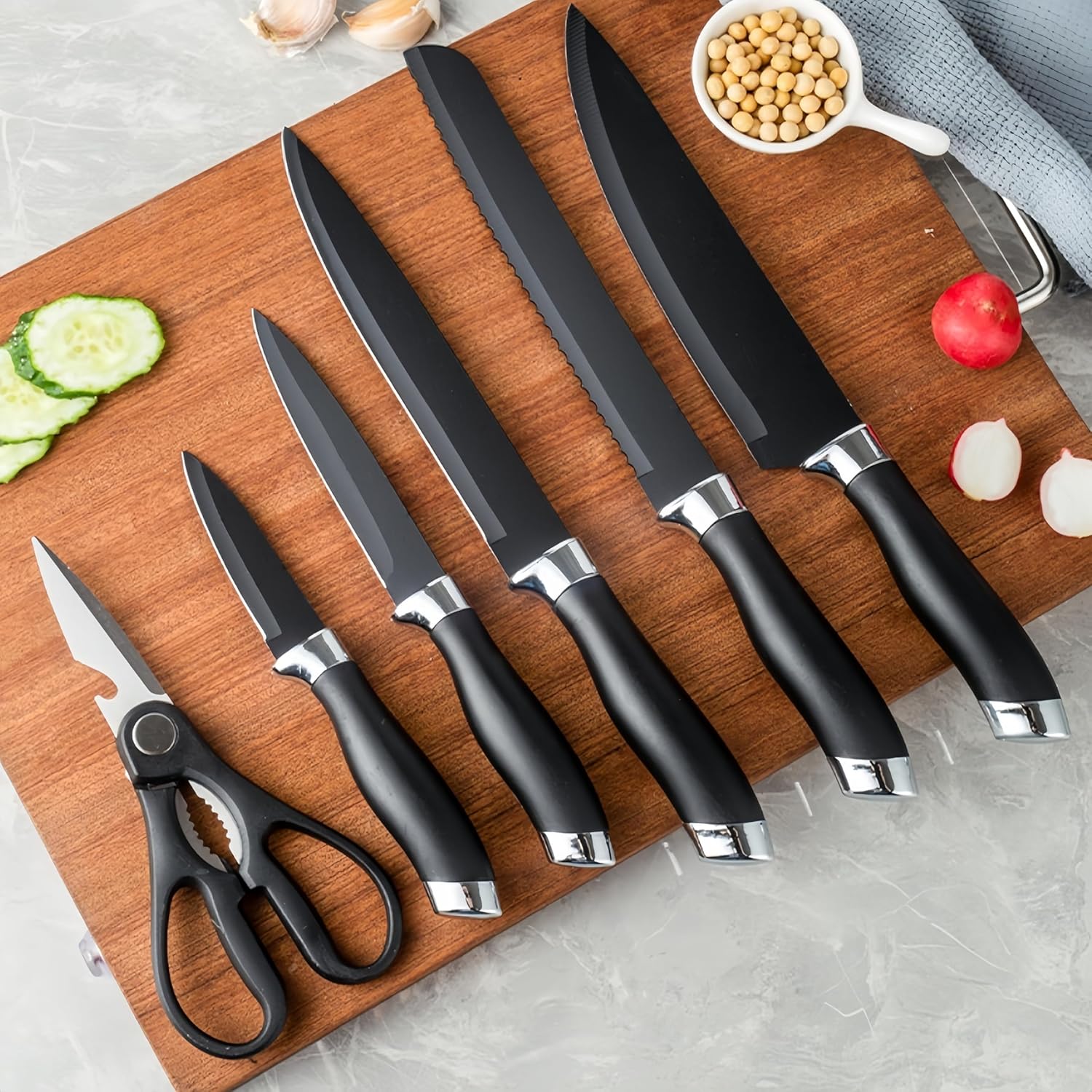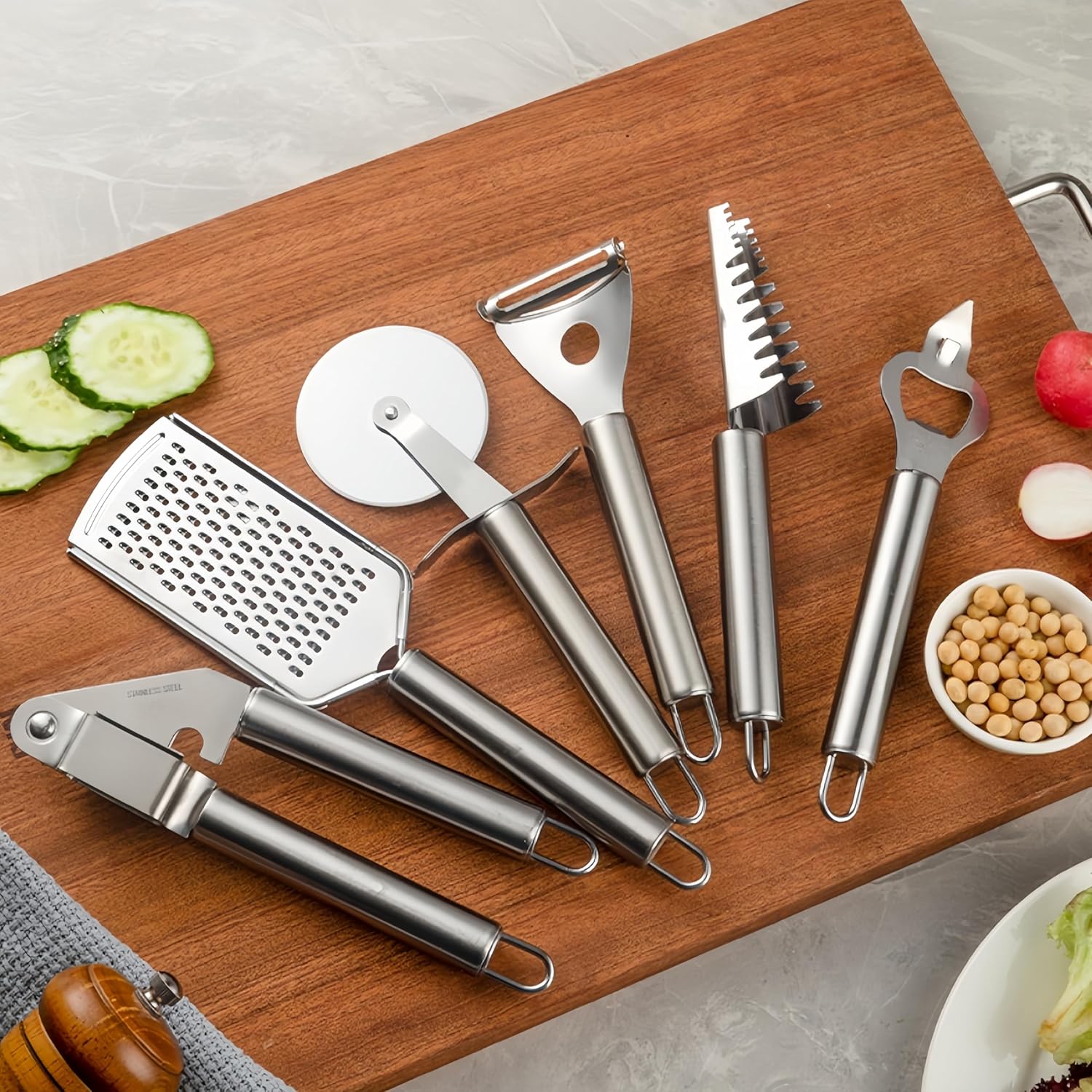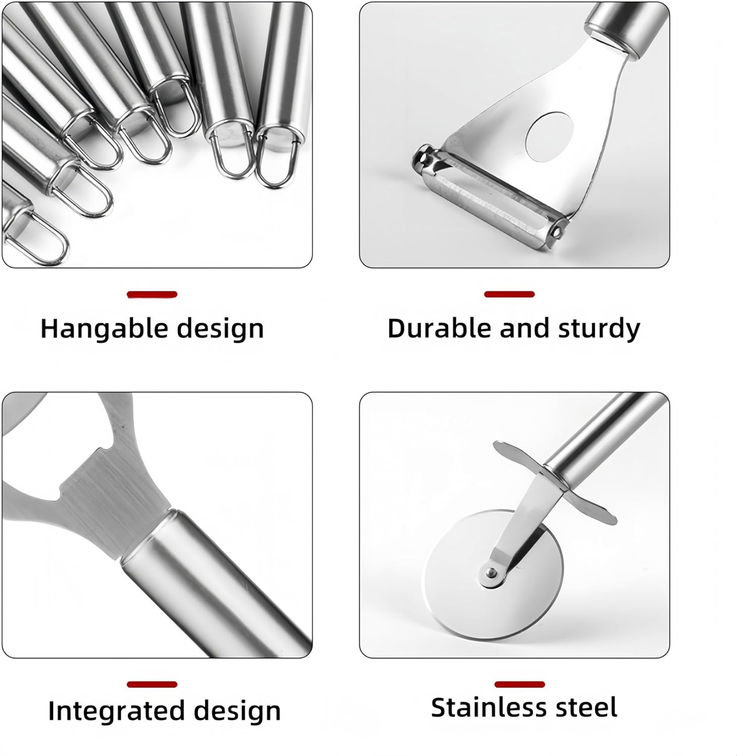 Included in the set are specialized kitchen knives with sharp blades that resist rust, providing a comfortable grip for precise cutting. The stainless steel kitchenware offers a smooth texture and diverse functions, making meal preparation efficient.