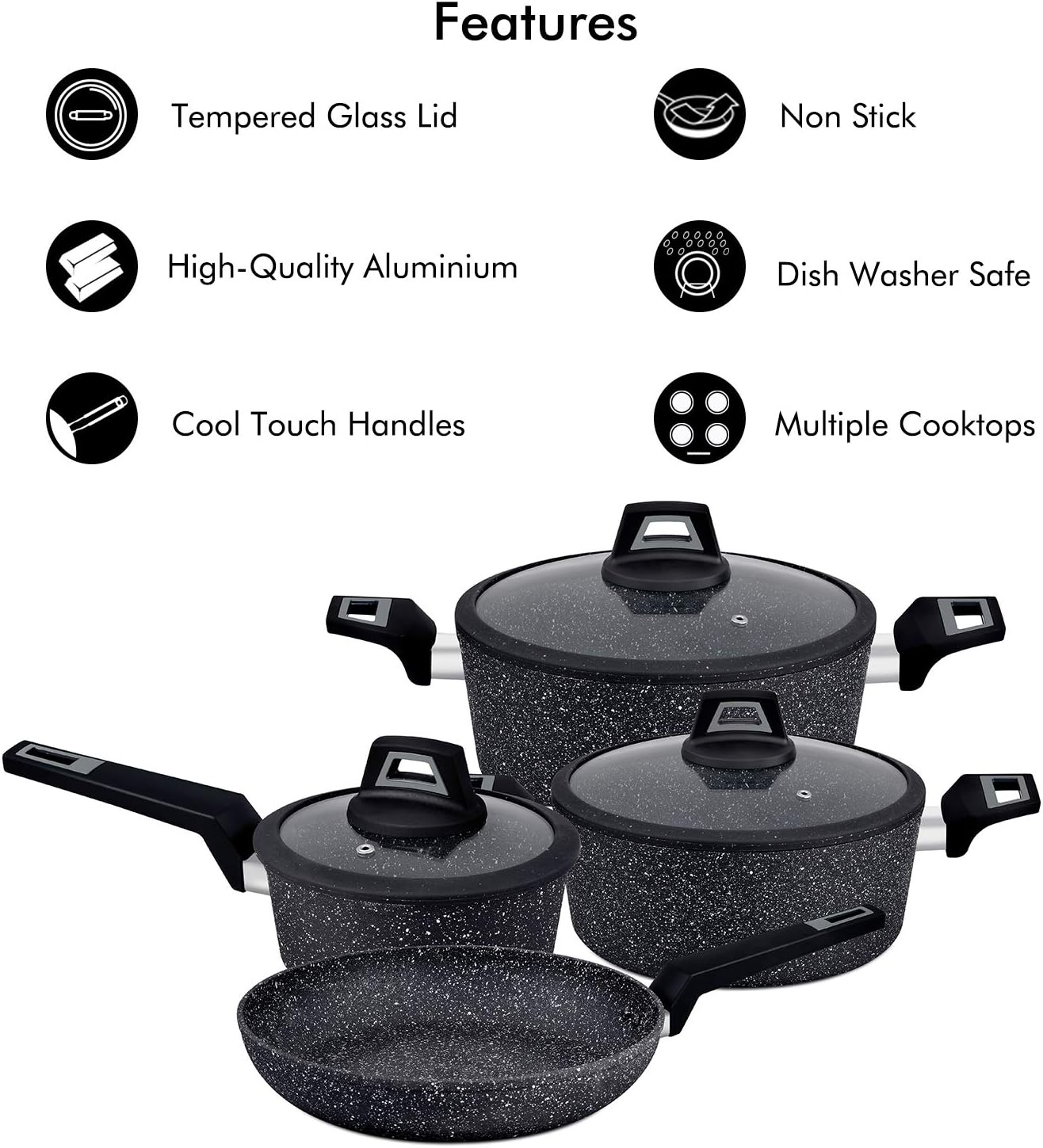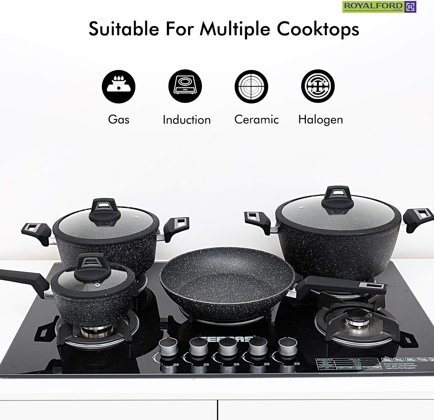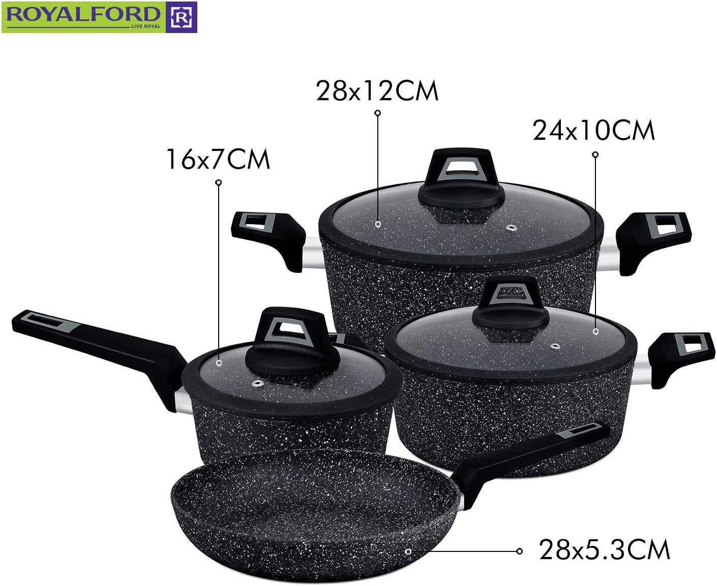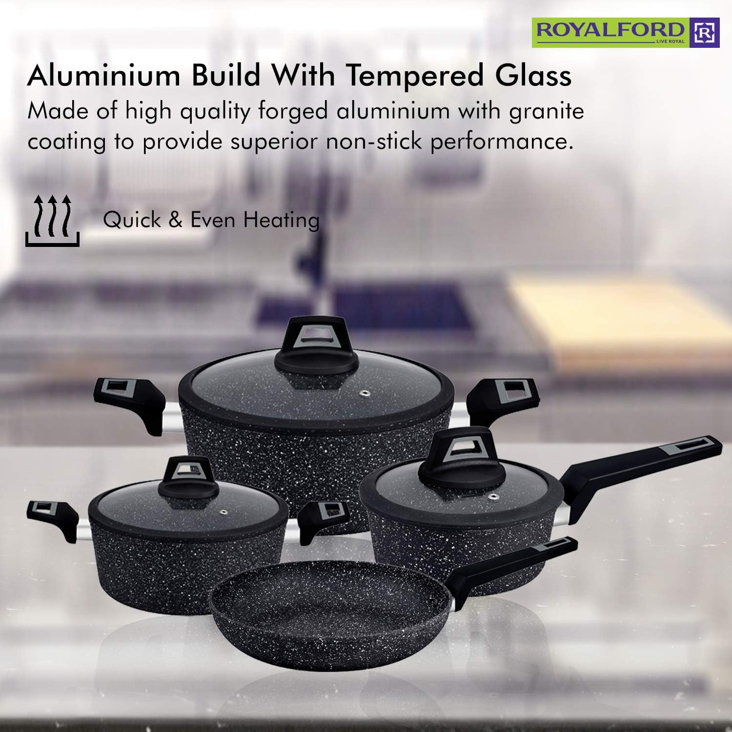 Royalford Chef Art Aluminium Cookware Set, 7 Pieces, Black, RF9557, Scratch Resistant, Tempered Glass Lids, 2.5MM Body Thickness, Bakelite Knobs, and CD Bottom