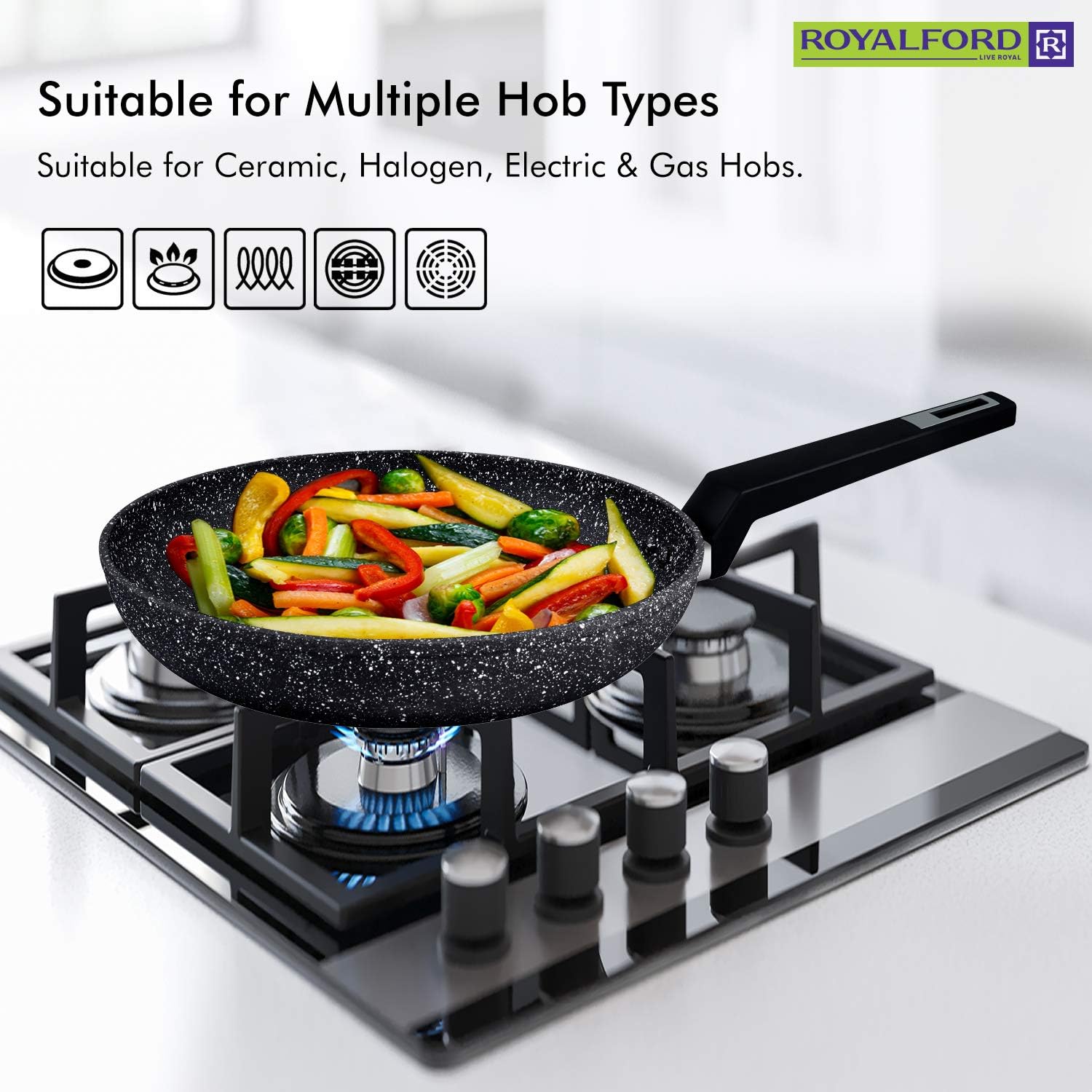 The Royalford Chef Art Aluminium Cookware Set is designed for both performance and durability. This 7-piece set features a non-stick granite coating that ensures easy cooking and cleaning. With a 2.5mm body thickness, it promotes quick and even heat distribution, making meal preparation efficient.