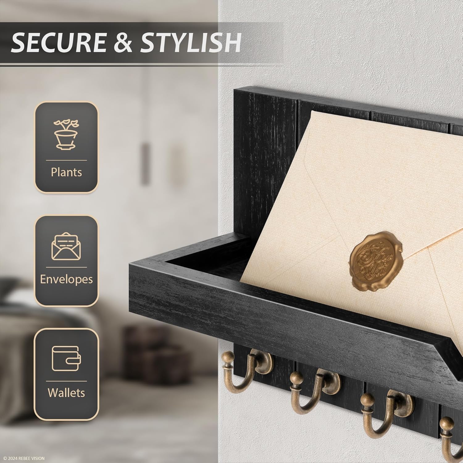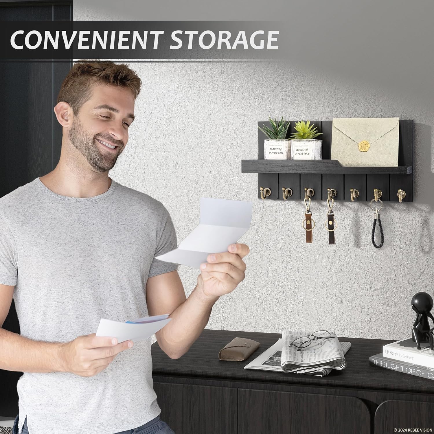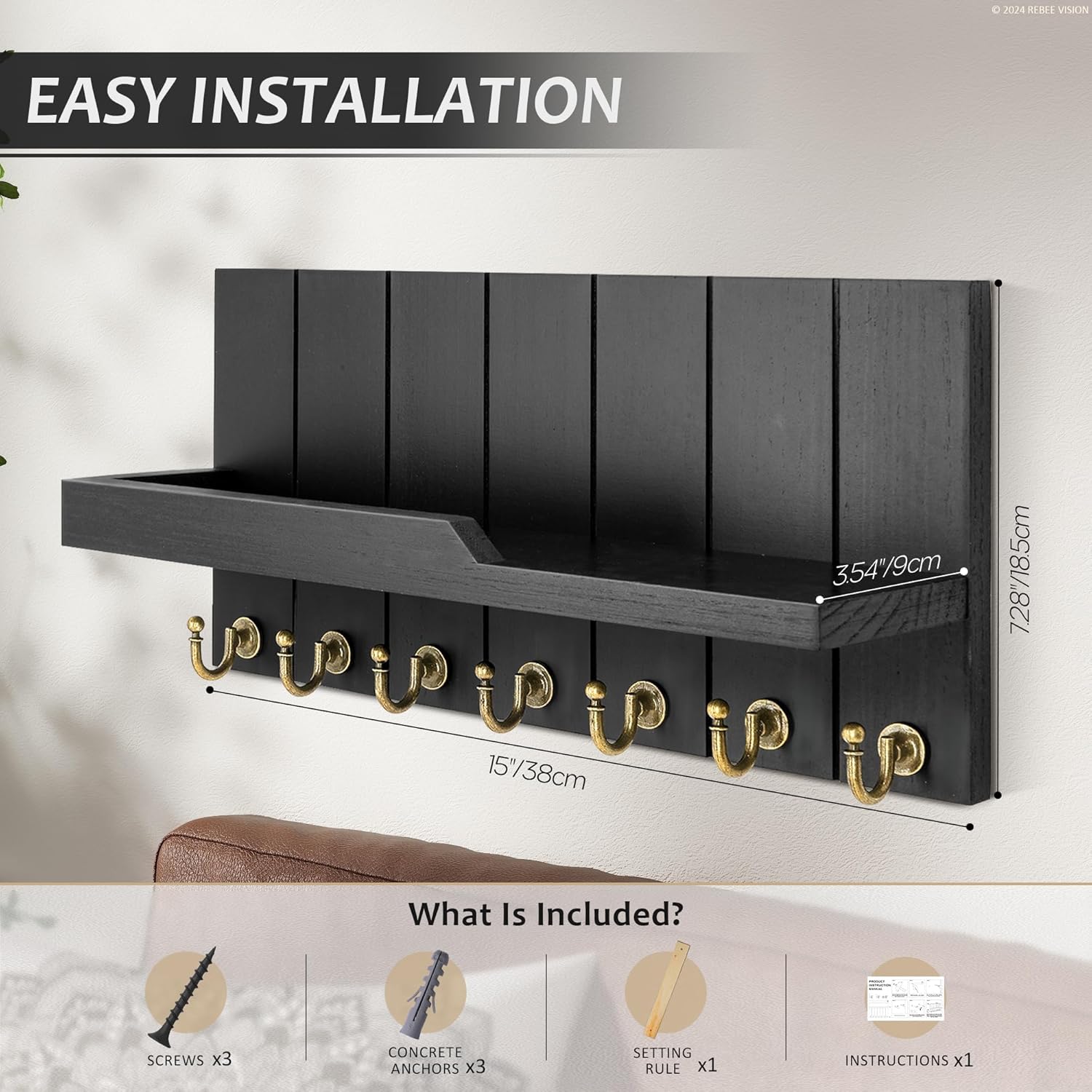 Rustic Farmhouse Wall Mounted Key Holder, Mail Organizer with 7 Durable Hooks, 15-Inch Floating Shelf for Entryway Wall Decor, Space-Saving Home Storage (Black)