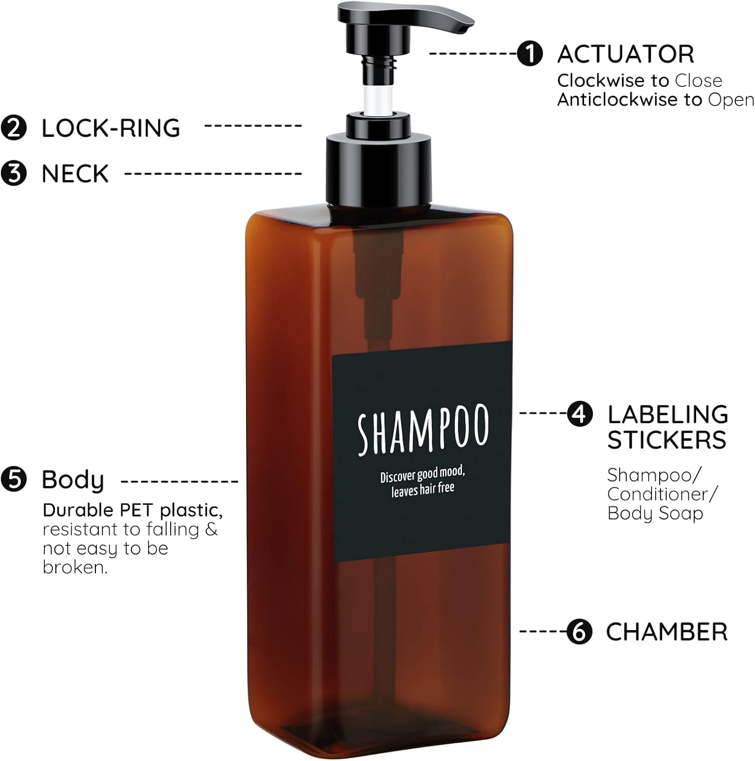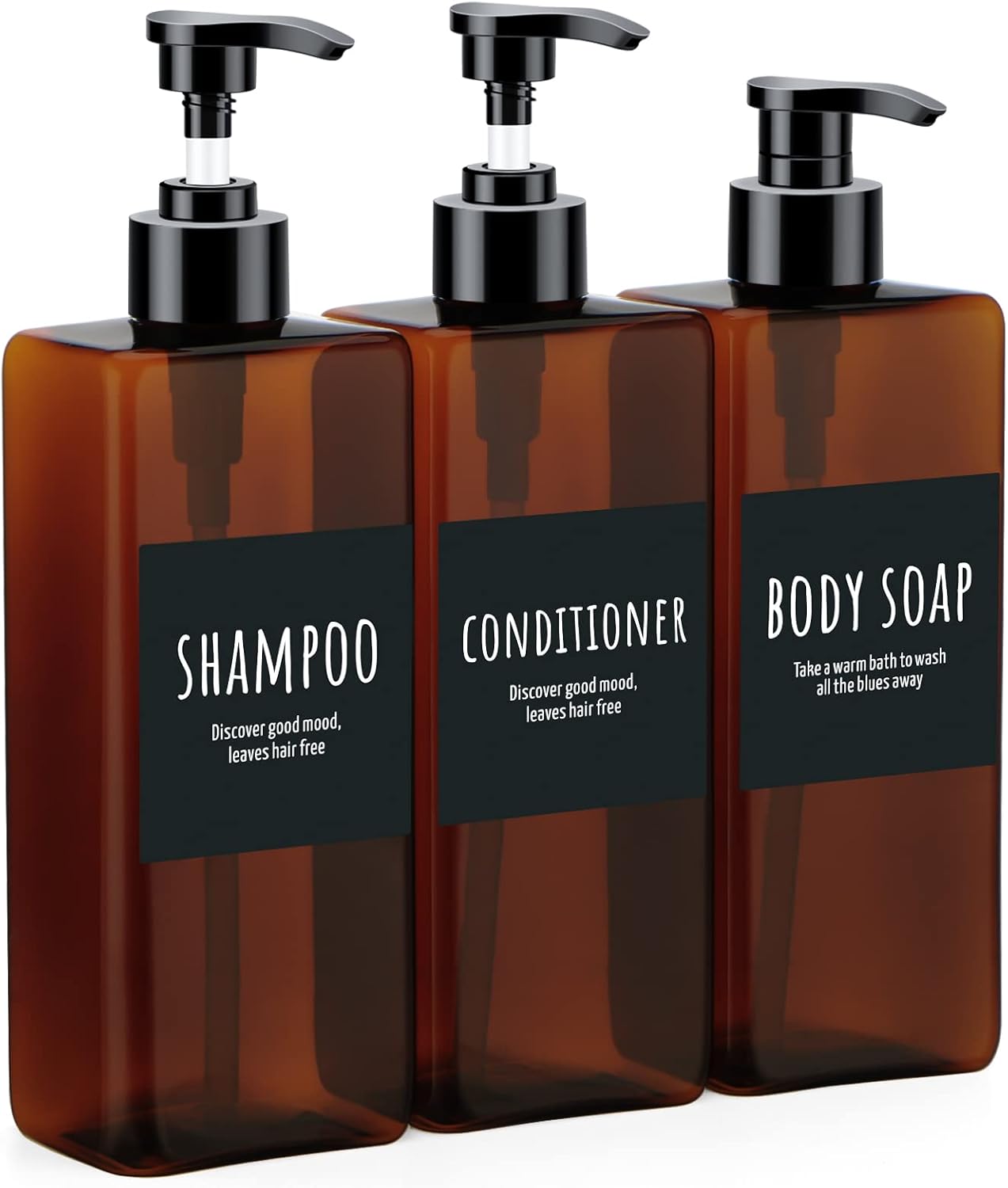 Segbeauty 16.9oz Shampoo Bottles, 3pcs 500ml Pump Press Shower Containers with Labels, Empty Refillable Shampoo Body Soap Conditioner Shower Gel Plastic Bathroom Press Lotion Dispenser Amber