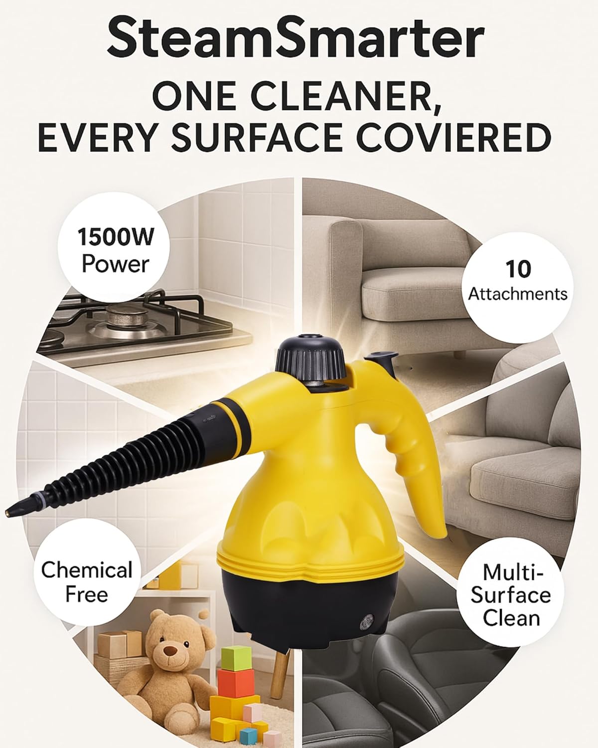 The Steam Cleaner Handheld 1500W is designed for efficient cleaning in various areas of your home. With its powerful 1500W heating element, it heats up in just 30 seconds, providing high-pressure steam to tackle tough stains and messes.