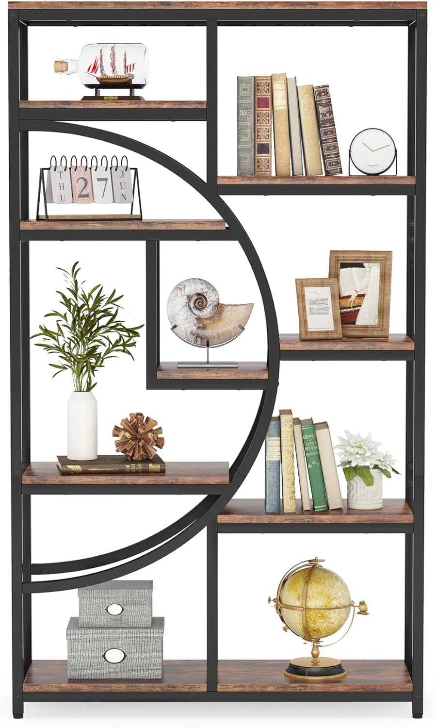 The Tribesigns Bookshelf is an elegant addition to any living room or bedroom. Featuring a striking geometric design, this industrial-style 5-tier etagere bookcase combines a sturdy black metal frame with rustic brown boards. Its unique half-moon silhouette adds a sophisticated touch to your decor.