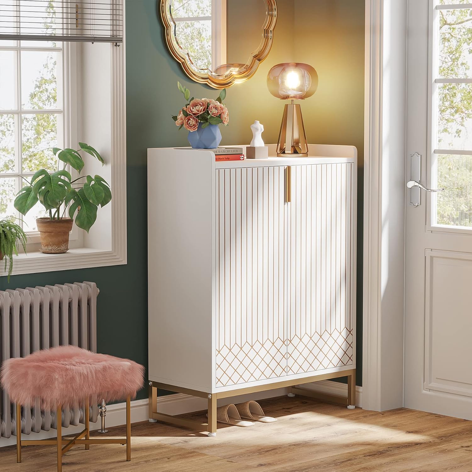 The Tribesigns Shoe Cabinet is designed to help you organize your shoe collection efficiently. With its spacious 5-tier design, this cabinet can accommodate 22-25 pairs of shoes, making it an ideal solution for entryways, bedrooms, and hallways. The cabinet features doors that provide concealed storage, keeping your shoes out of sight while maintaining a tidy appearance.