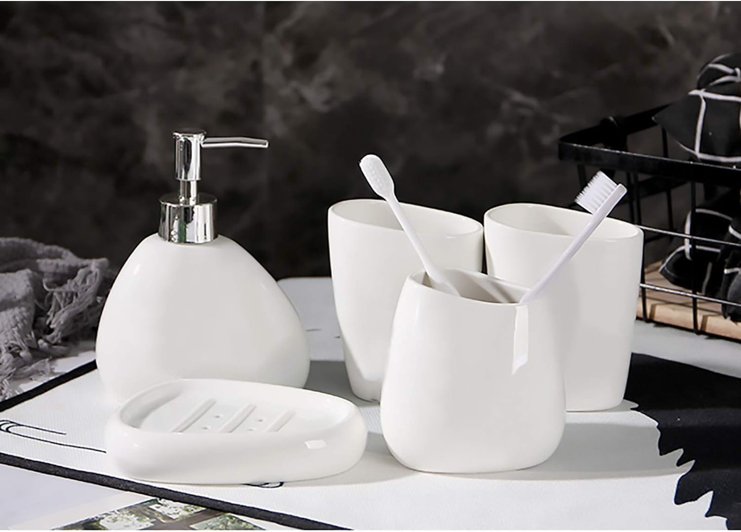 This White Ceramic Bathroom Accessory Set is designed to enhance your bathroom experience with its practical and stylish features. The set includes a soap dispenser, a toothbrush holder, two tumblers, and a soap dish, all made from high-quality dolomite ceramic. This material is more durable than glass or plastic, ensuring longevity and sturdiness in a humid environment.
